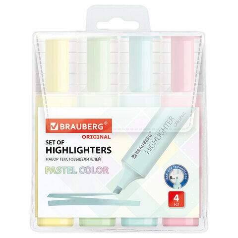Маркер-текстовыделитель (для выделения текста) Brauberg "Original Pastel", набор из 4 штук, ассорти цветов, линия 1-5 мм интересное: