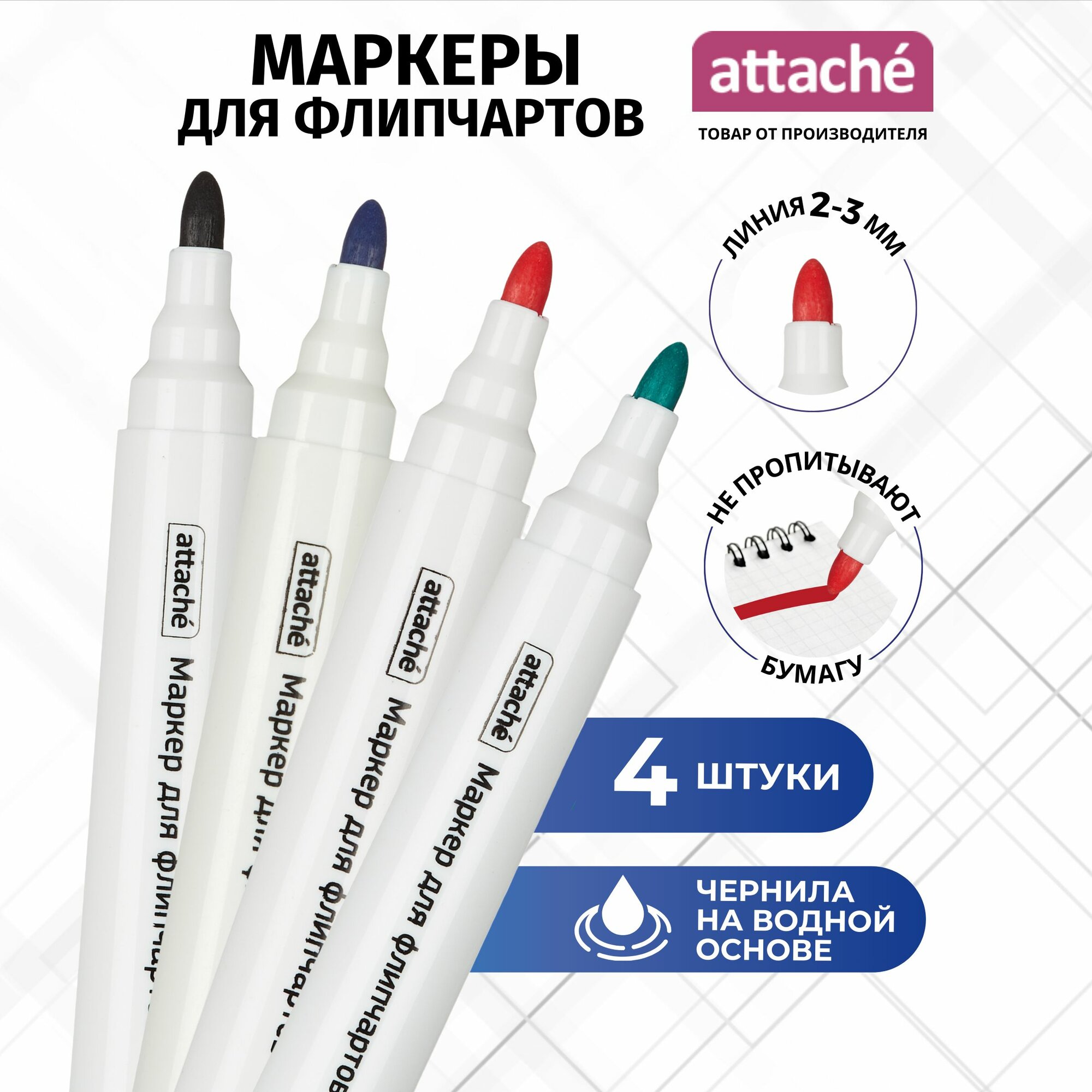 Маркеры для письма на бумаге для флипчартов Attache, на водной основе, толщина линии 2-3 мм, 4 штуки