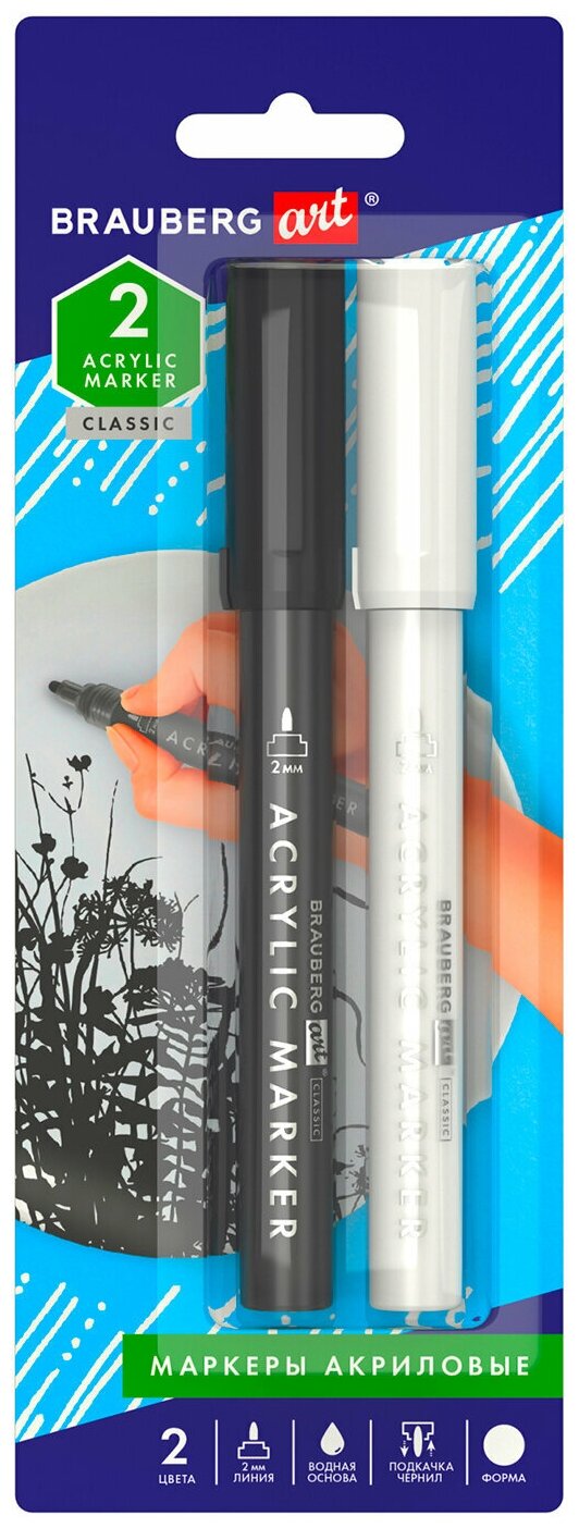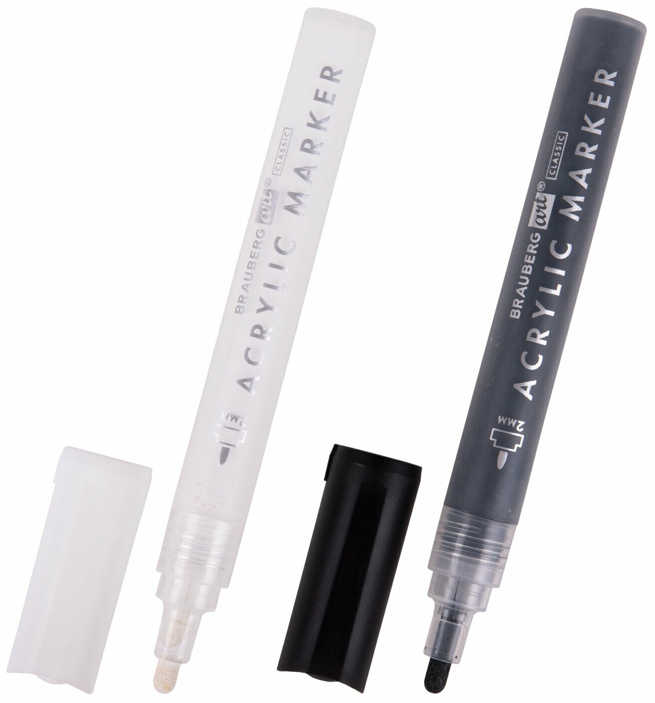 Маркеры акриловые перманентные для скетчинга / граффити / рисования Brauberg, Набор 2 шт., Чёрный/белый, наконечник 2 мм интересное: