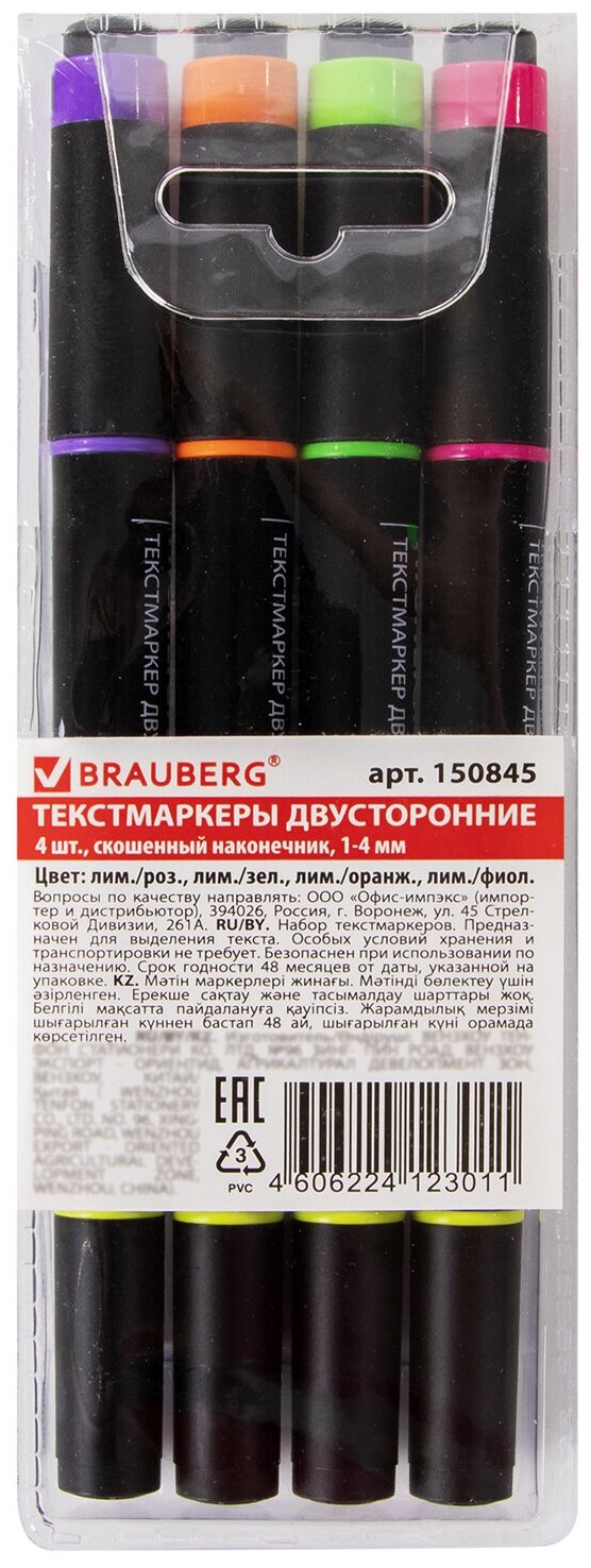Набор текстовыделителей двусторонних Brauberg Dual Tip 4 шт., Ассорти, линия 1-4 мм, 150845 интересное: