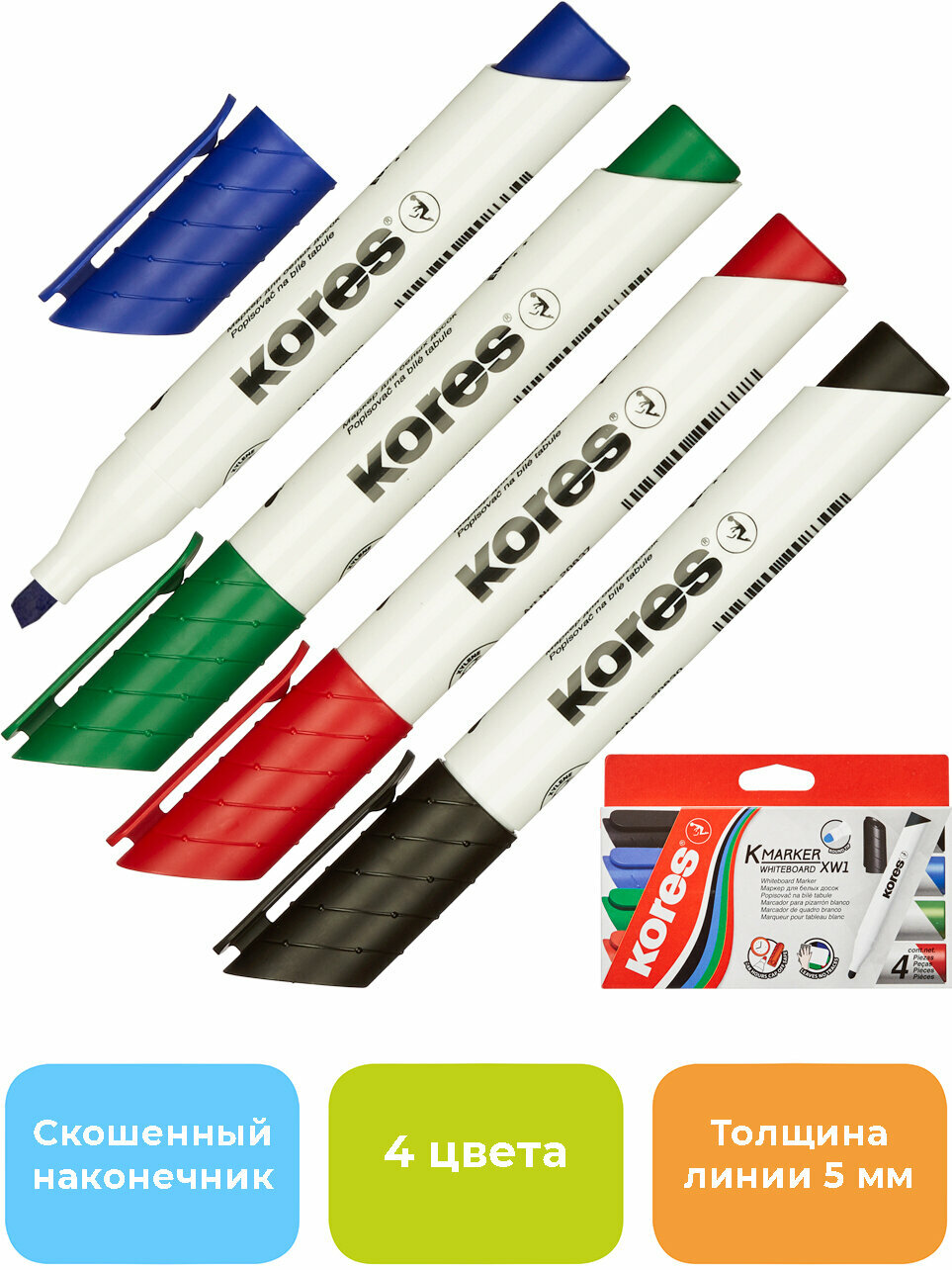 Маркеры для белой магнитной доски Kores, стираемые, на водной основе, линия 3-5 мм, 4 шт