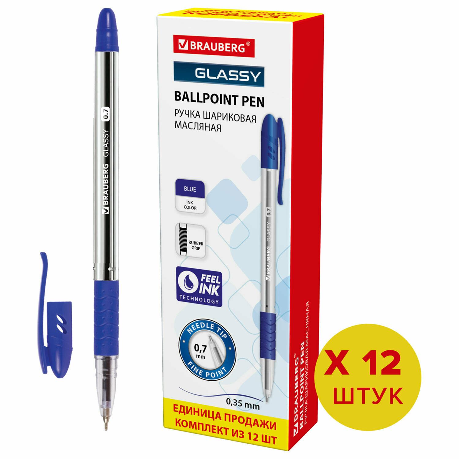 Ручка шариковая масляная с грипом BRAUBERG Glassy, комплект 12 штук, синяя, узел 0,7мм, 880180 интересное: