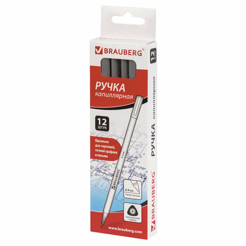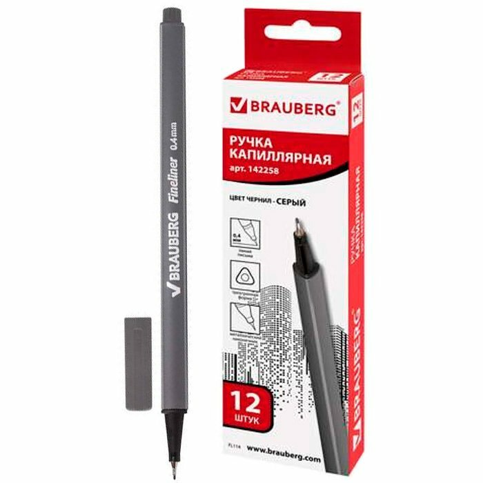 Ручка капиллярная Brauberg Aero (0.4мм, метал.наконечник, трехгранная) серая, 12шт. (142258)
