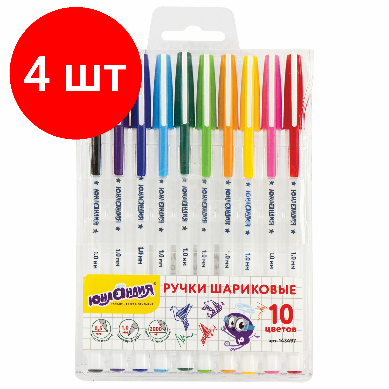 Купить Комплект 4 шт, Ручки шариковые юнландия "радуга", набор 10 цветов, длина письма 2000 м, узел 1 мм, линия письма 0.5 мм, 143497