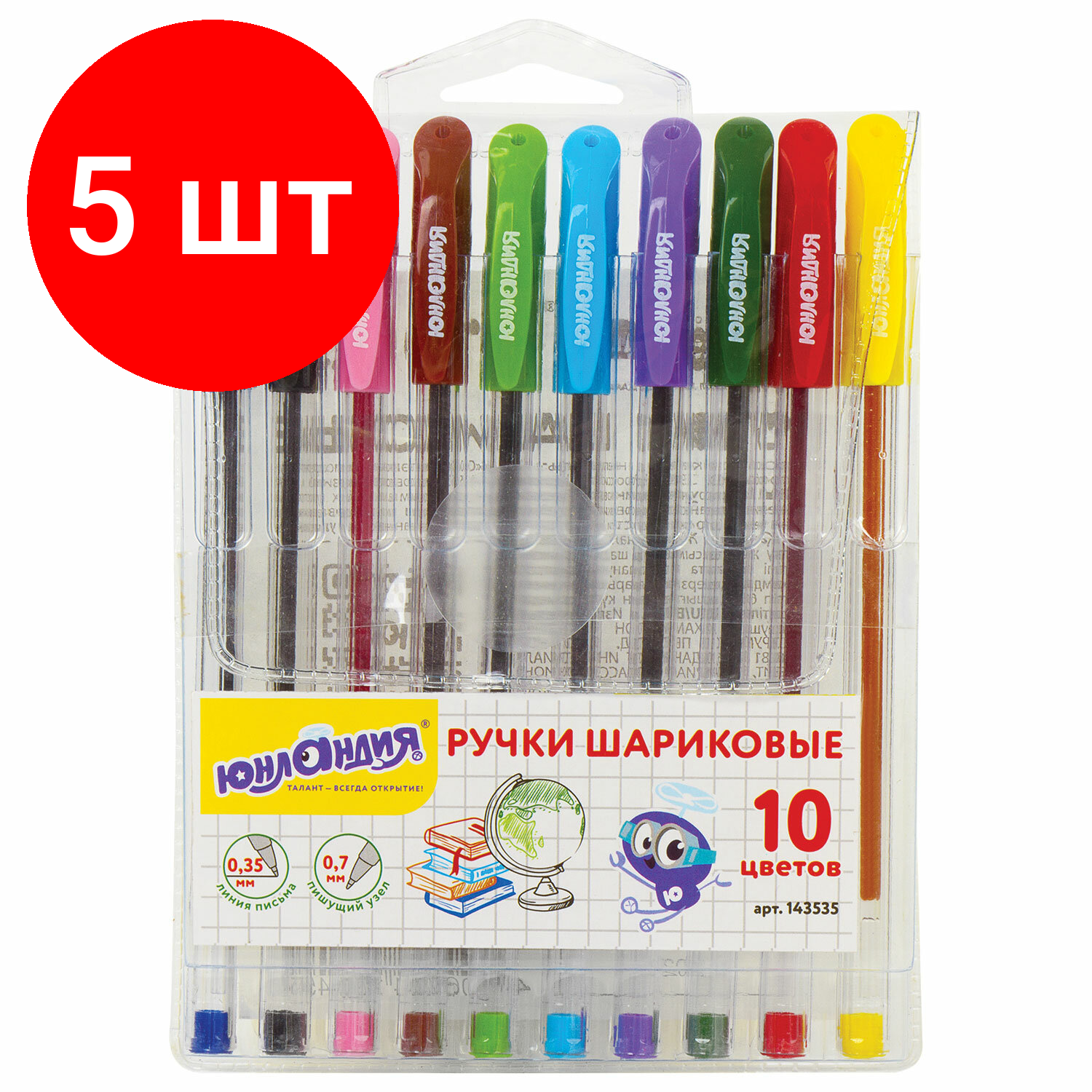 5 шт, Ручки шариковые масляные юнландия "классная", набор 10 цветов, узел 0,7 мм, линия письма 0,35 мм, 143535