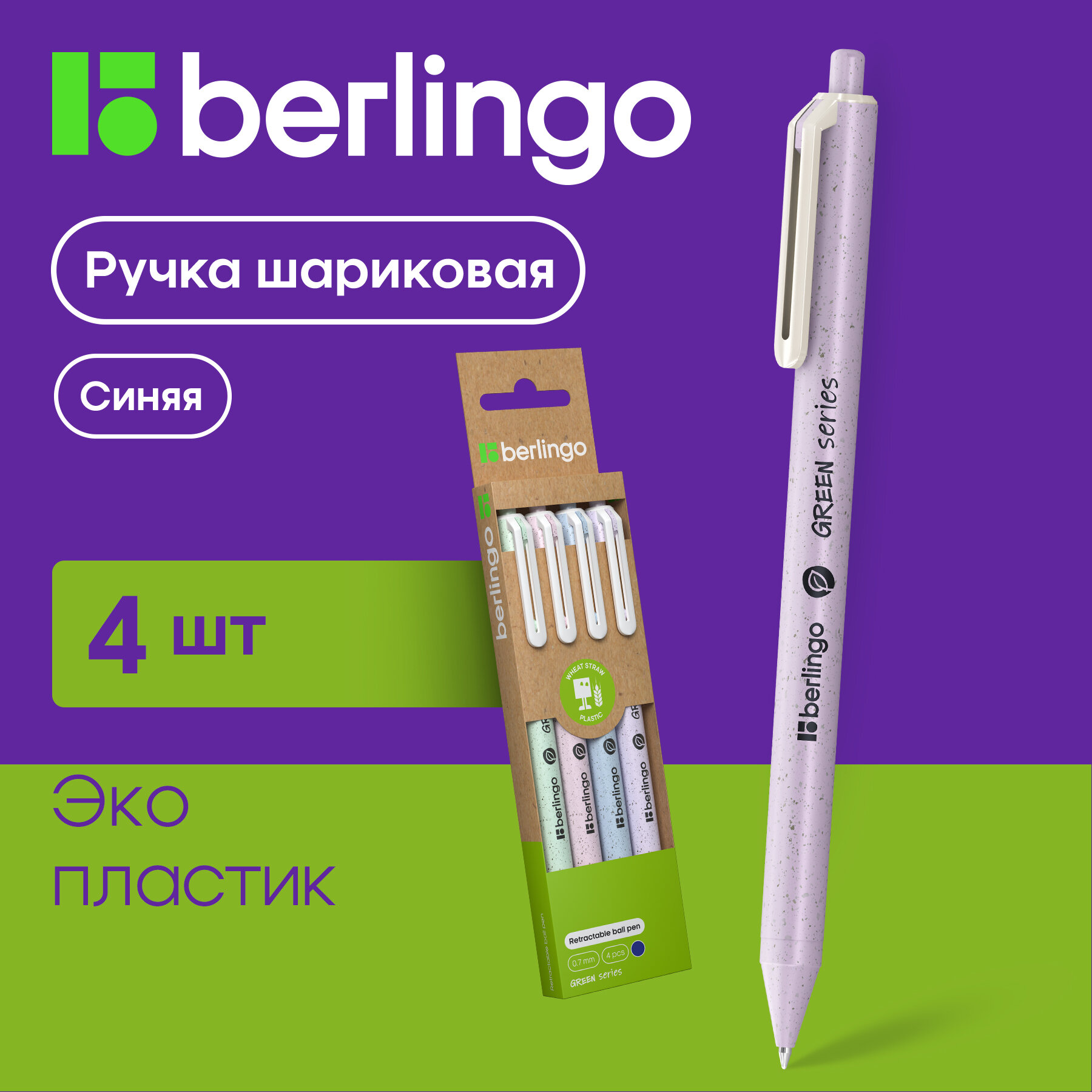 Купить Ручки шариковые синие набор для школы 4 шт / комплект Berlingo "Green Series" / линия письма 0,7 мм smart ink (легкое, мягкое касание бумаги)/канцелярия для офиса