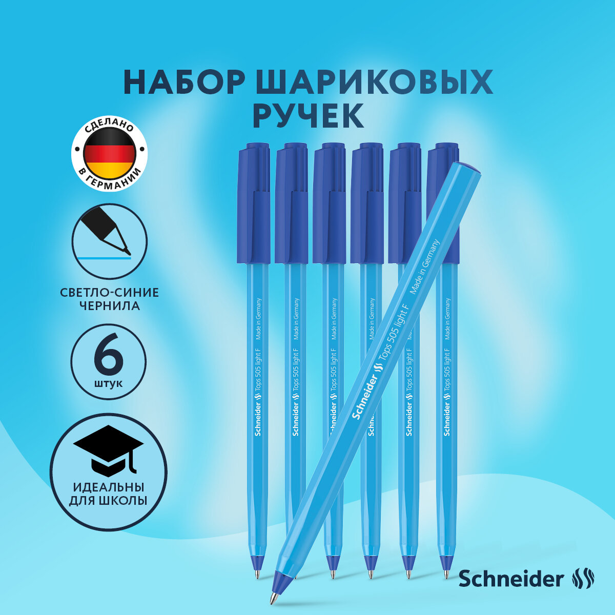 Ручка шариковая синяя Schneider "Tops 505 F Light " линия 0,4 мм, шестигранный корпус голубого цвета, набор 6 штук, канцелярия для школы и офиса