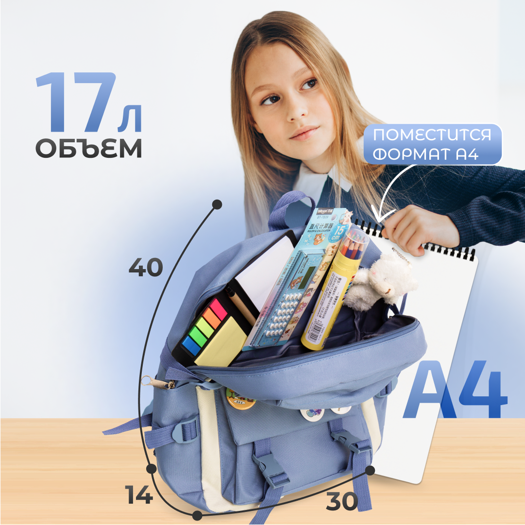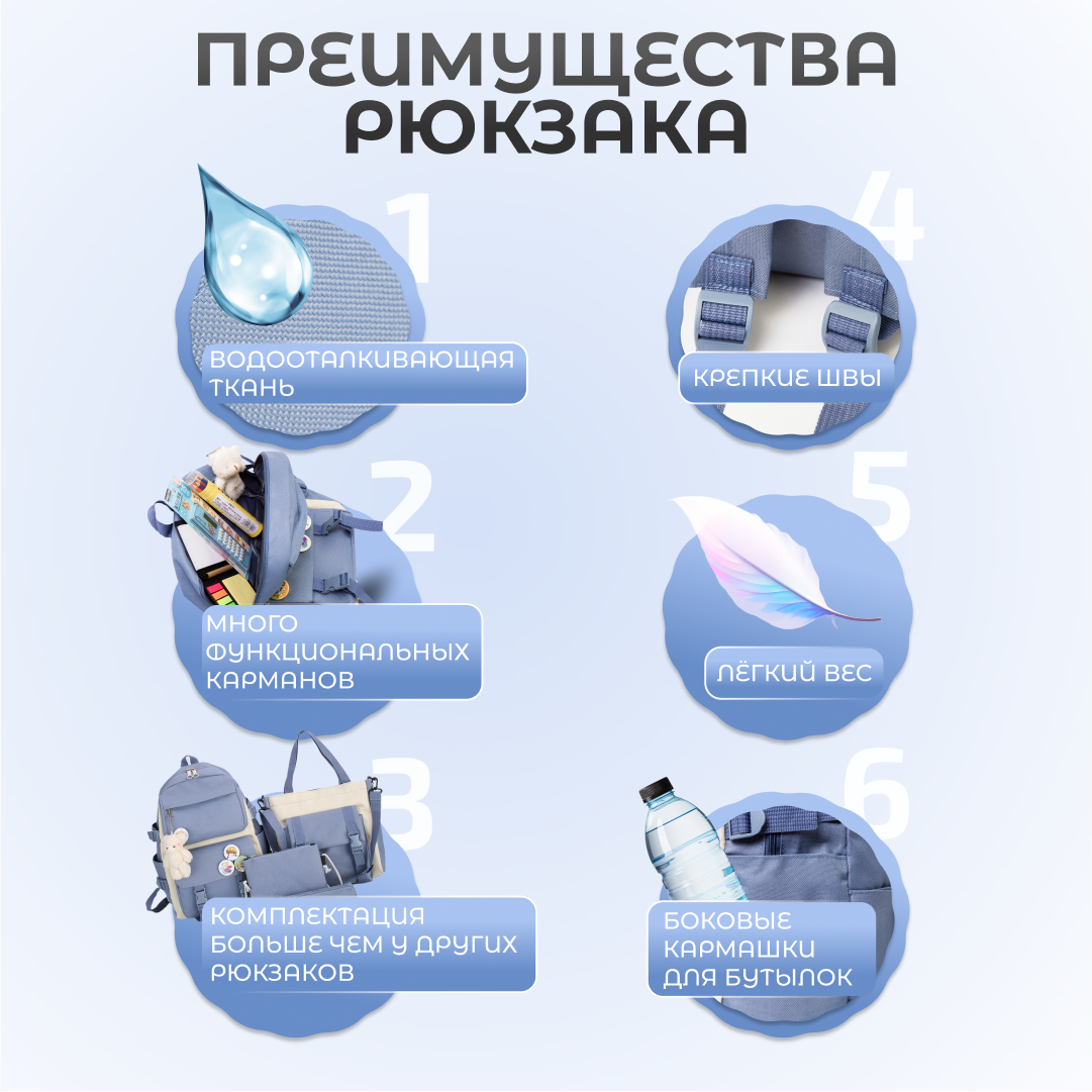 СохранитьРюкзак школьный Набор 9 в 1: Стильный и Модный, для Девочек и Мальчиков, идеально подходит для Школы, Туризма и Спорта, Повседневный. Голубой интересное: