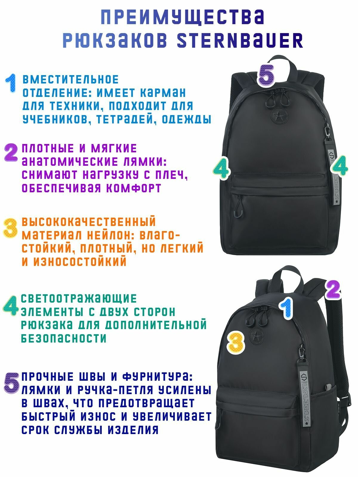 СохранитьSTERNBAUER Ранец женский летний городской молодежный стильный вместительный/ Школьный рюкзак для девочки, девушки черный без принта/ Повседневный портфель для учебы прогулок спорта тренировок ноутбука интересное: