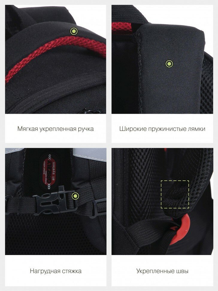 | Особенности | вентилируемая спинка / вентилируемые лямки / водоотталкивающая пропитка / жесткое дно / ножки / ортопедический / разделитель в главном отделении / регулируемые лямки / светоотражающие элементы |