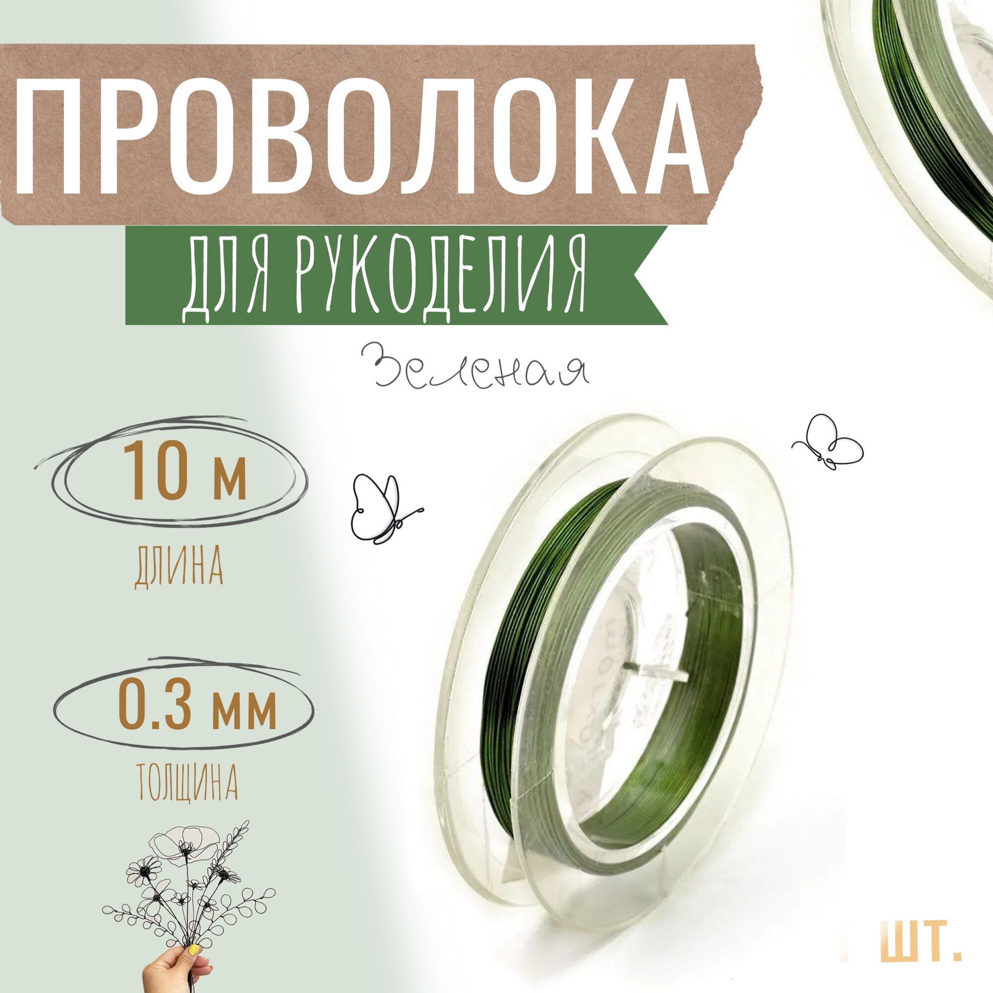 Проволока для бисера, рукоделия 0,3мм х 10метров, флористическая вязальная, оцинкованная зелёная