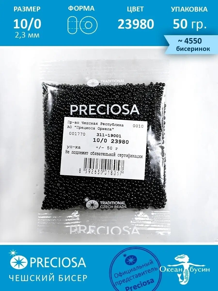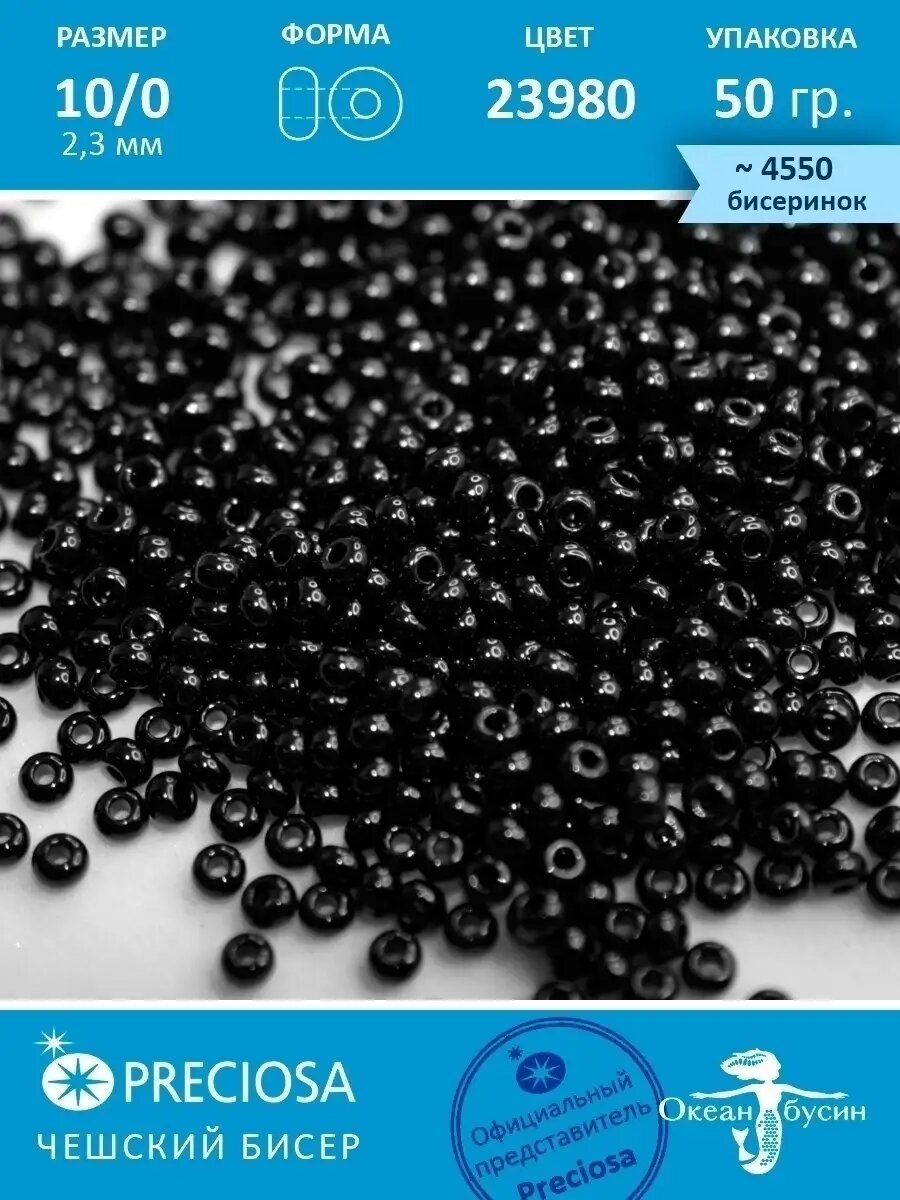 Бисер чешский PRECIOSA круглый 10/0 23980 черный непрозрачный, 1 сорт, 50г
