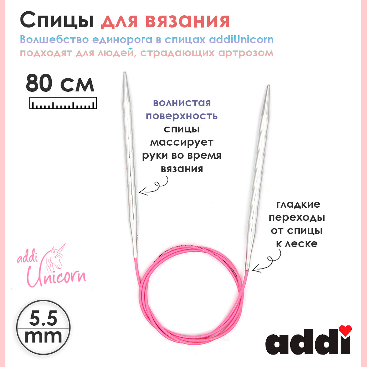 115-7 Спицы металлические круговые супергладкие addiUnicorn, 5,5 мм, 80 см