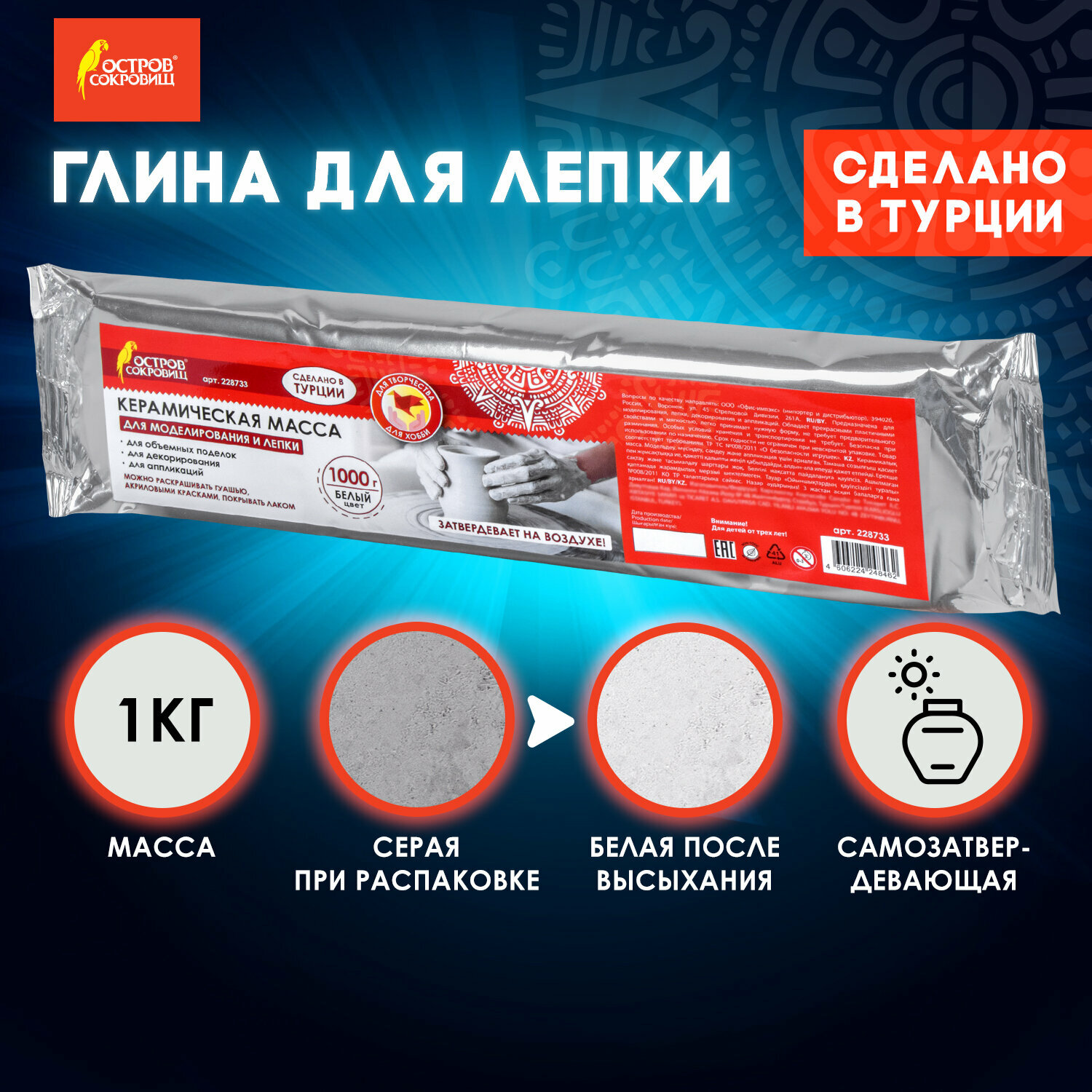 Купить Масса керамическая (глина) для скульптурной лепки самозатвердевающая художественная для творчества, Остров Сокровищ, 1000 г, натуральный белый, 228733