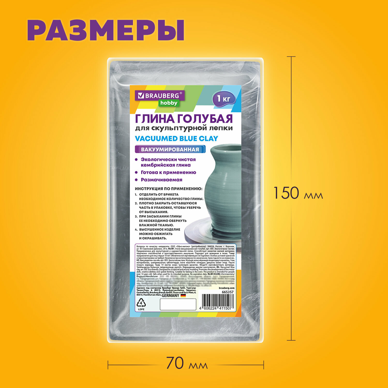 Глина для лепки голубая, 1 кг, вакуумированная, готовая, размачиваемая, BRAUBERG HOBBY, 665357