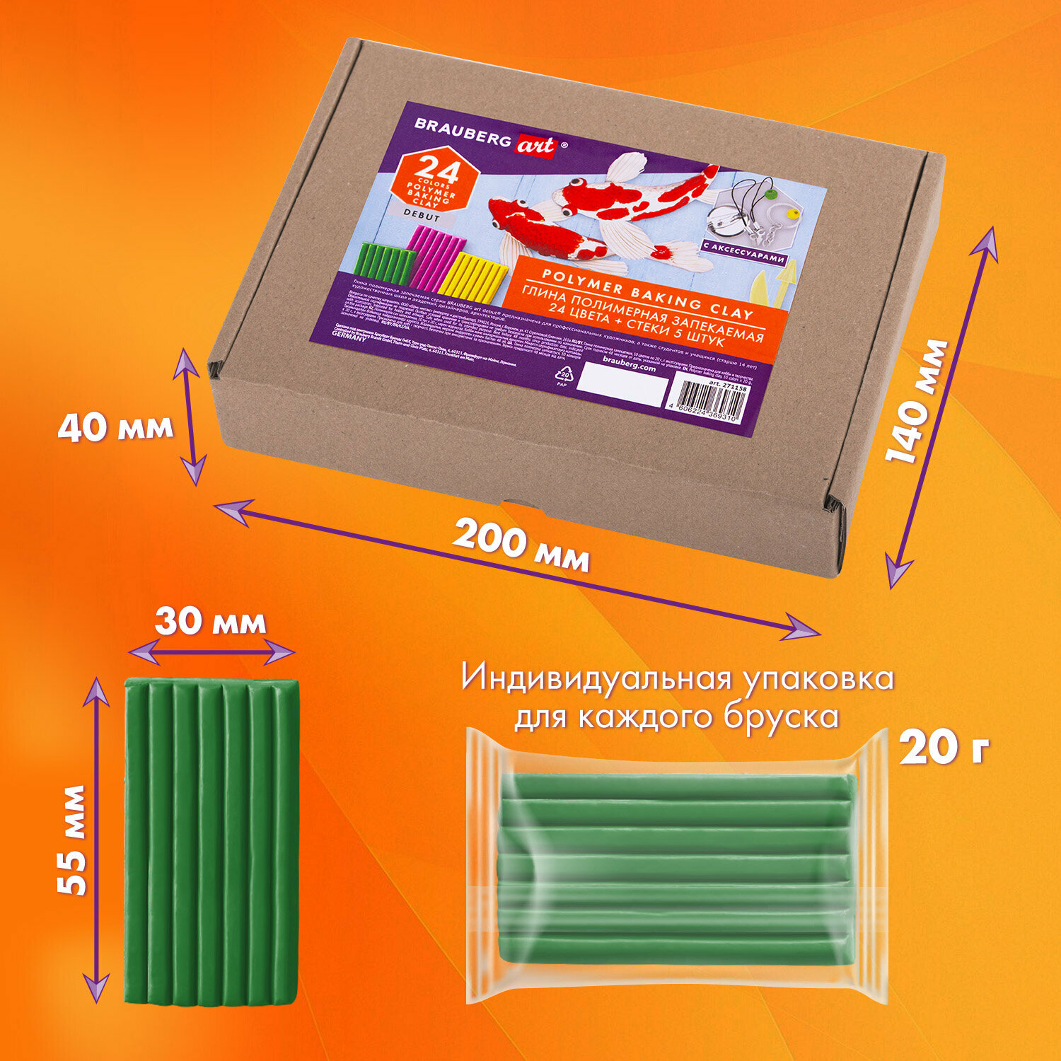 Глина полимерная запекаемая, набор 36 цветов по 20 г, с аксессуарами, в гофрокоробе, BRAUBERG, 271159