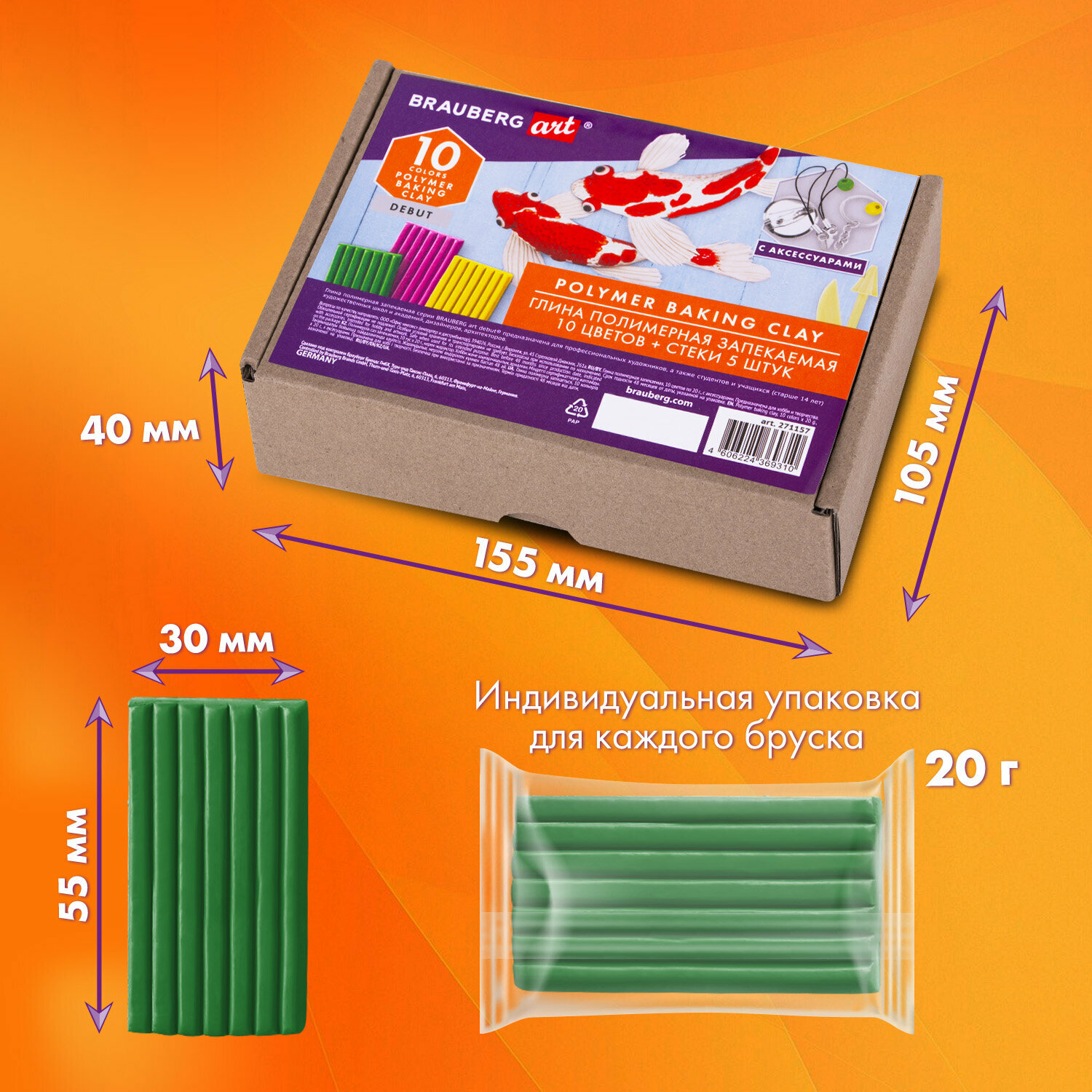 Глина полимерная запекаемая, набор 36 цветов по 20 г, с аксессуарами, в гофрокоробе, BRAUBERG, 271159