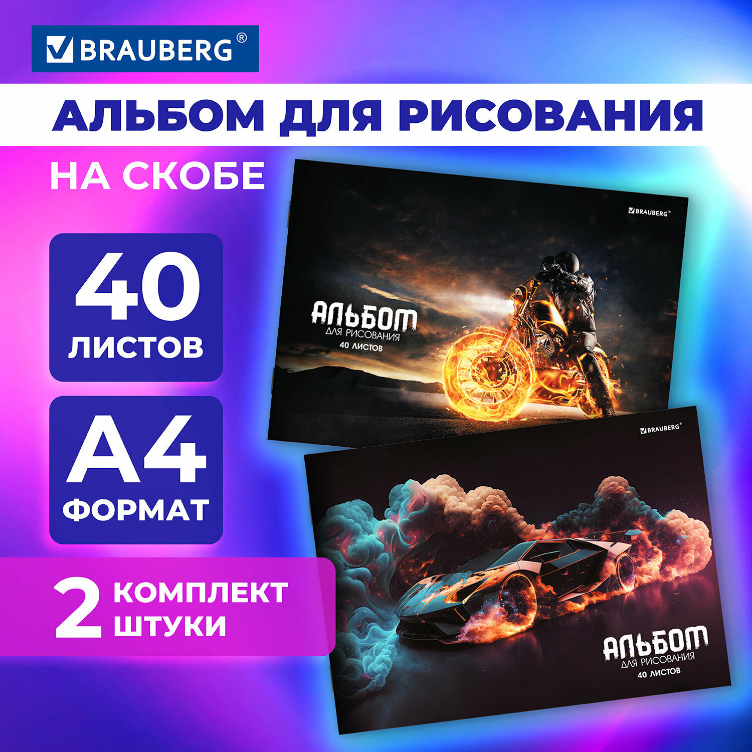 Купить Альбом для рисования 40 листов А4, комплект 2 штуки, скоба, обложка картон, Brauberg, 205х290 мм, В мире моторов, 106736