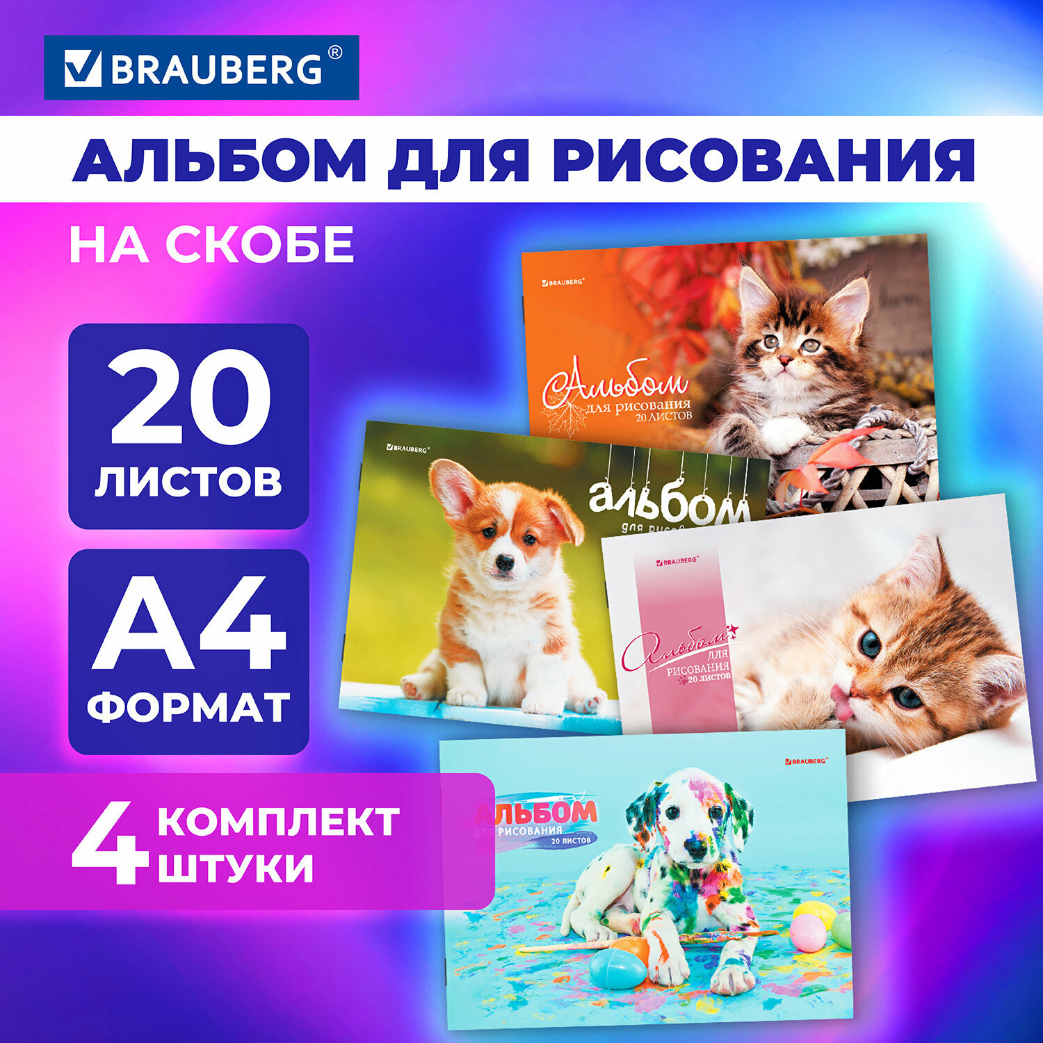 СохранитьАльбом для рисования 20 листов А4, комплект 4 штуки, скоба, обложка картон, Brauberg, 205х290 мм, Pets, 106732 интересное: