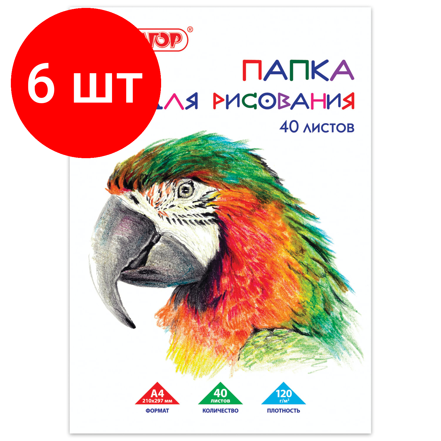 Купить Комплект 6 шт, Папка для рисования, А4, 40 л., 120 г/м2, пифагор, 210х297 мм, "Попугай", 129222