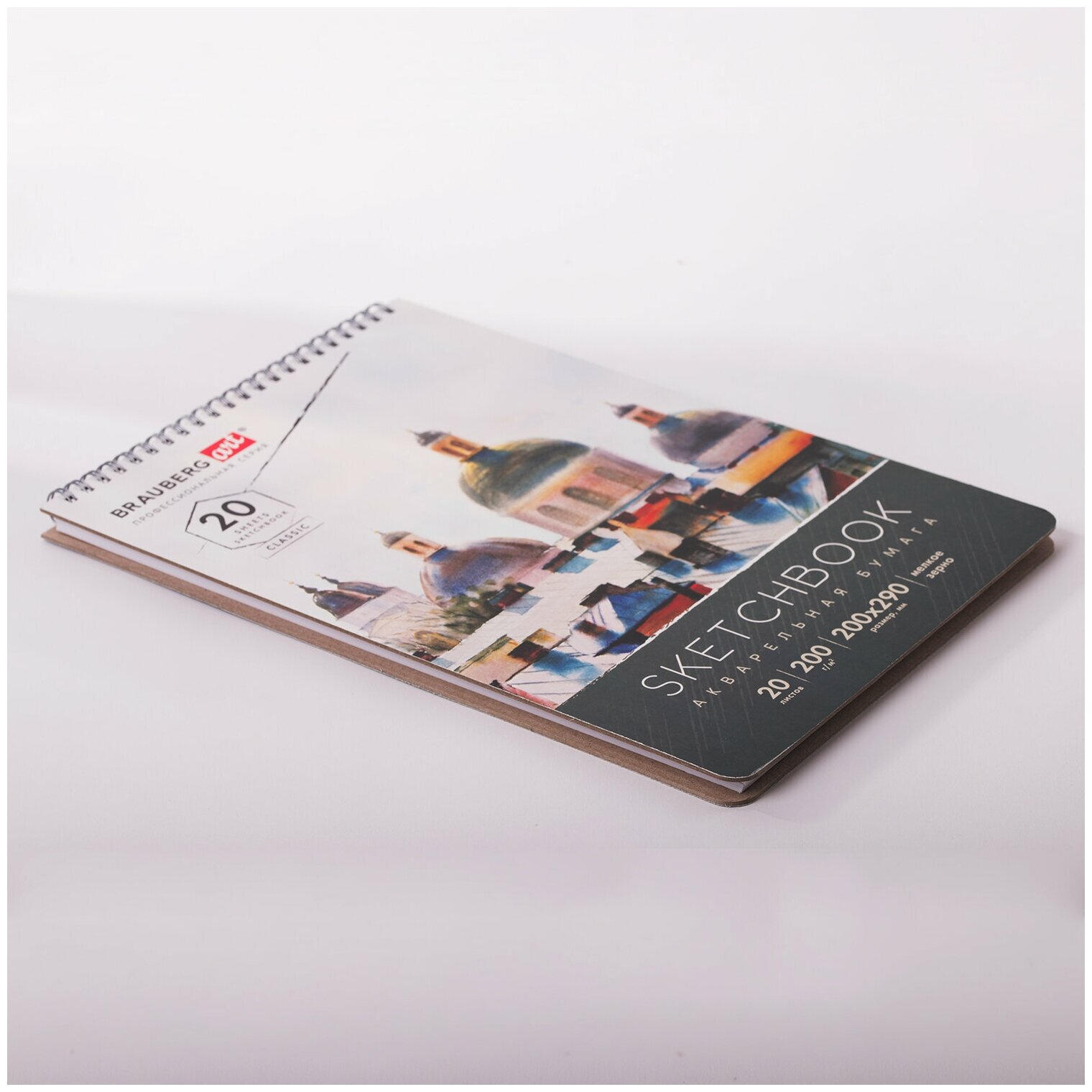 Блокнот-Скетчбук с белыми акварельными страницами для рисования эскизов 200г 195х195мм, 20л, мелкое зерно, гребень, Brauberg Art Classic