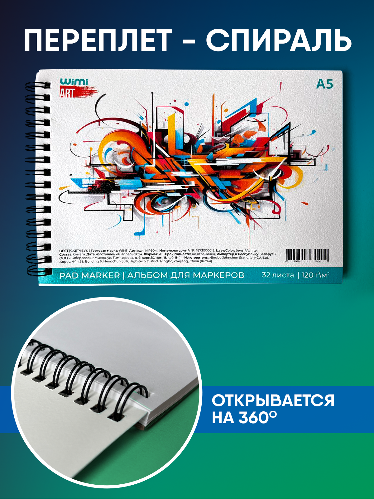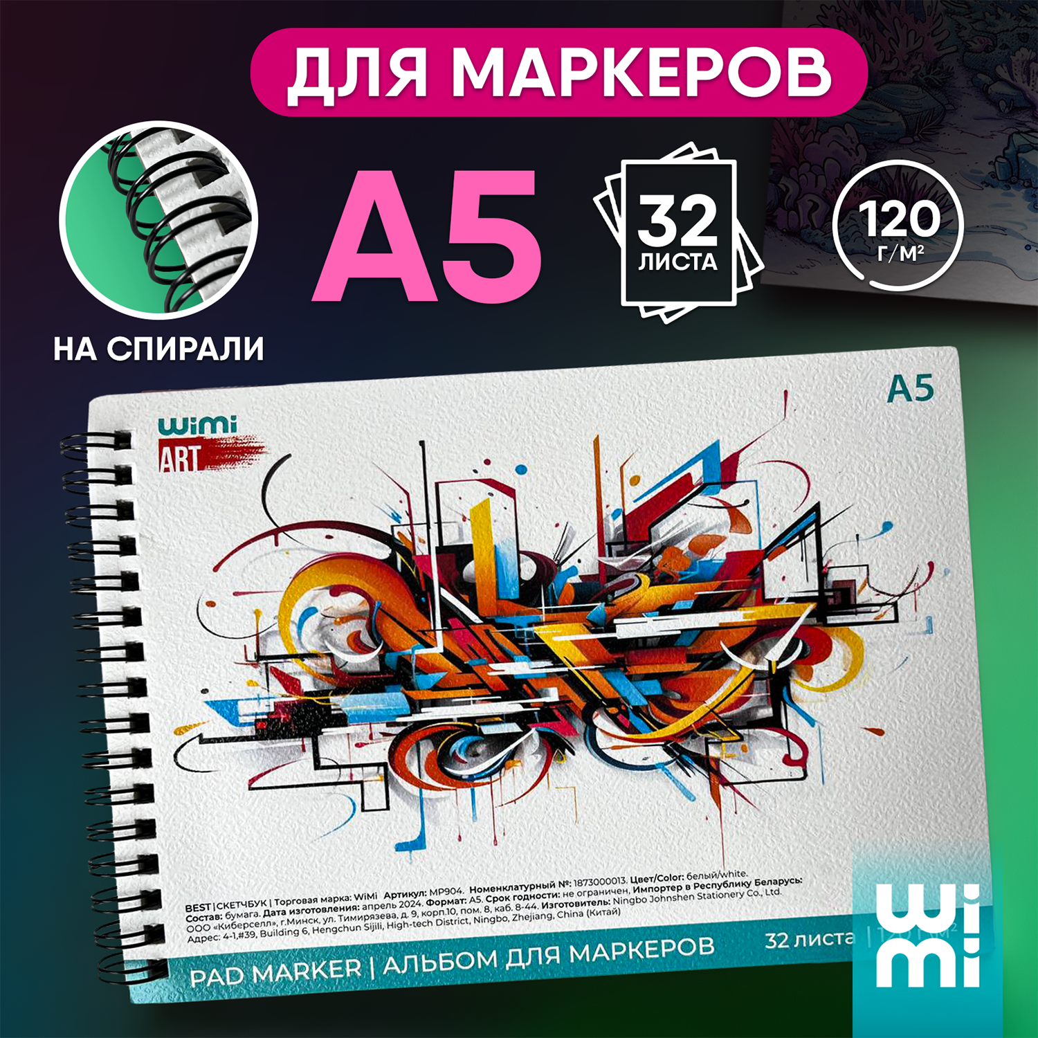 Скетчбук WiMi, для маркеров/карандашей/фломастеров, на спирали, A5, 32 листа, белый