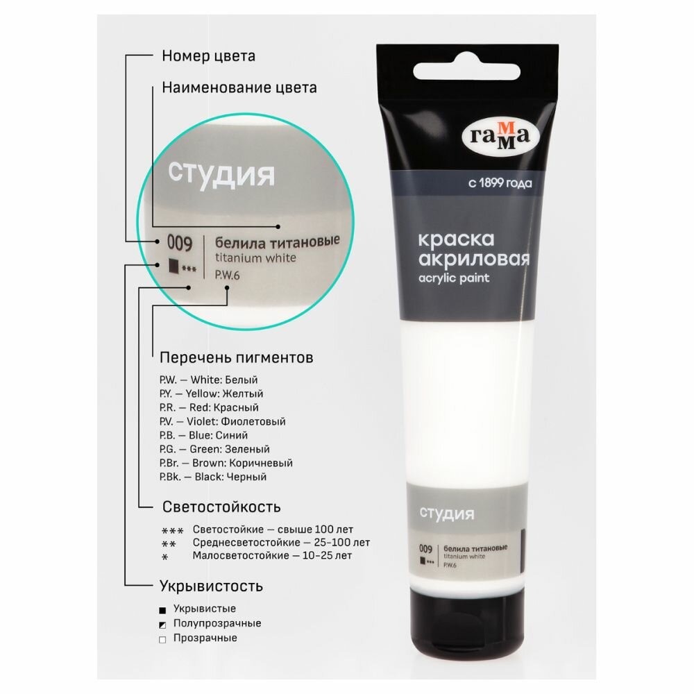 Купить Краска акриловая художественная Гамма "Студия", 110мл, пластиковая туба, белила титановые