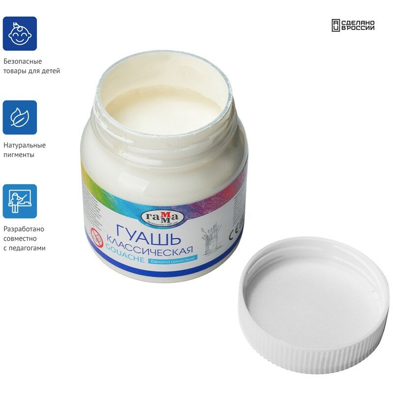 Гуашь для школы белая (белила титановые) / Краски для рисования детские Гамма "Классическая" в баночке / Набор красок для творчества и хобби детей