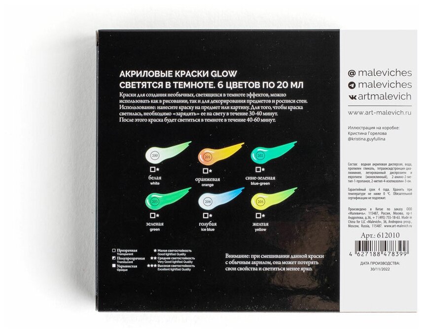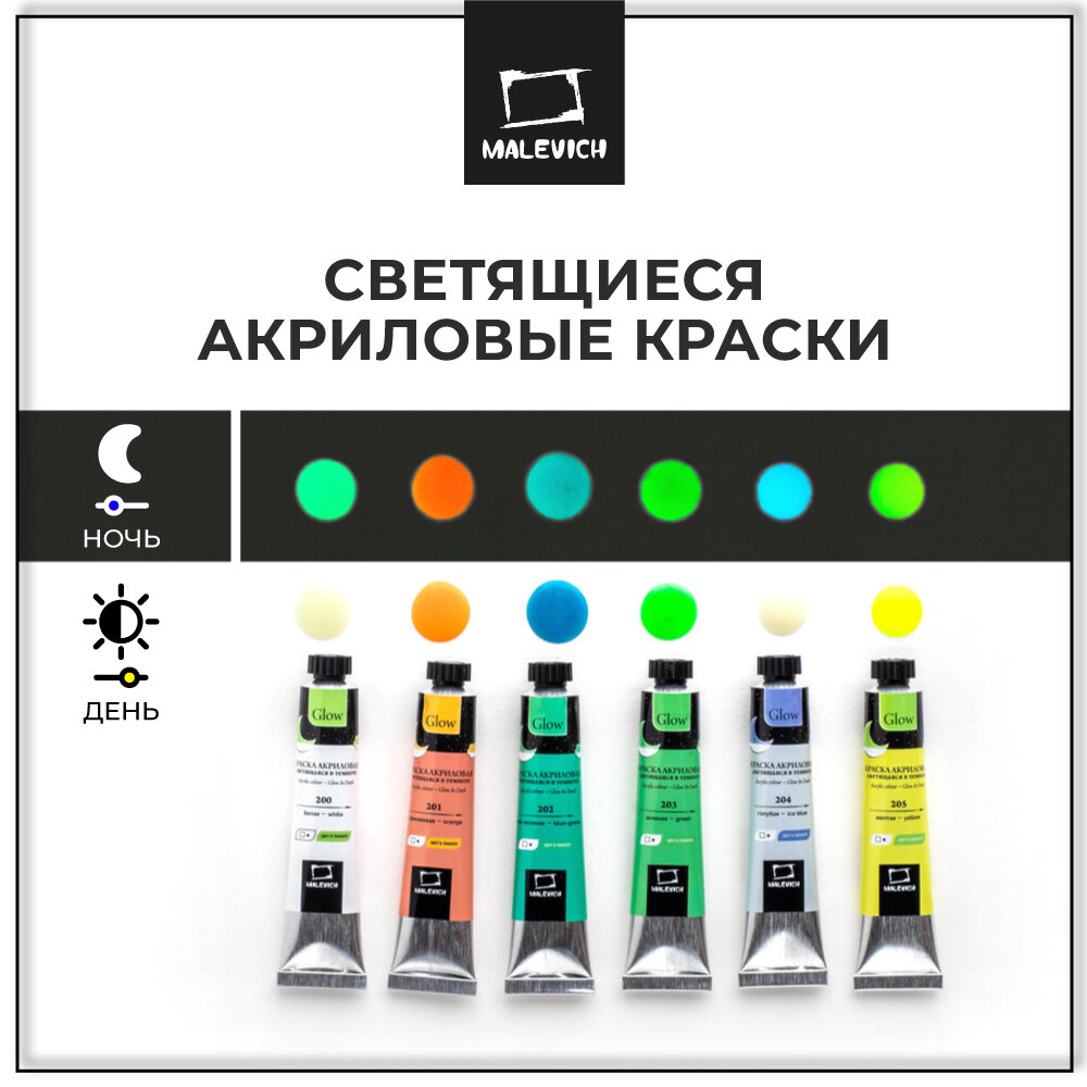 Набор акриловых красок Малевичъ Glow светящаяся в темноте, 6 цветов по 20 мл интересное: