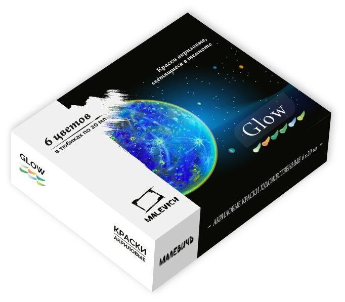 Купить Набор акриловых красок Малевичъ Glow светящаяся в темноте, 6 цветов по 20 мл