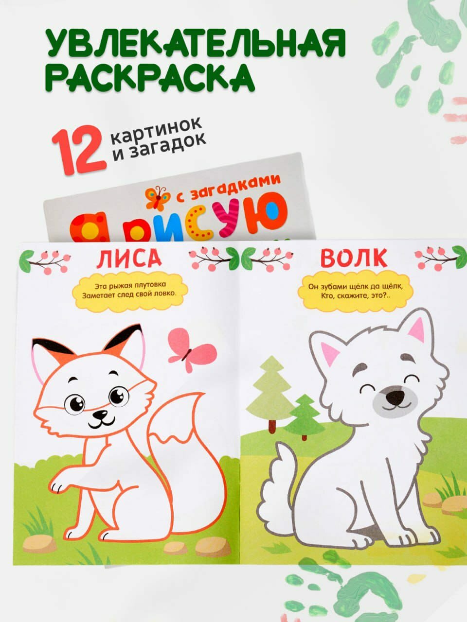 | Комплектация | пальчиковые краски 6 цветов, раскраска пальчиковая с загадками, валик для рисования |