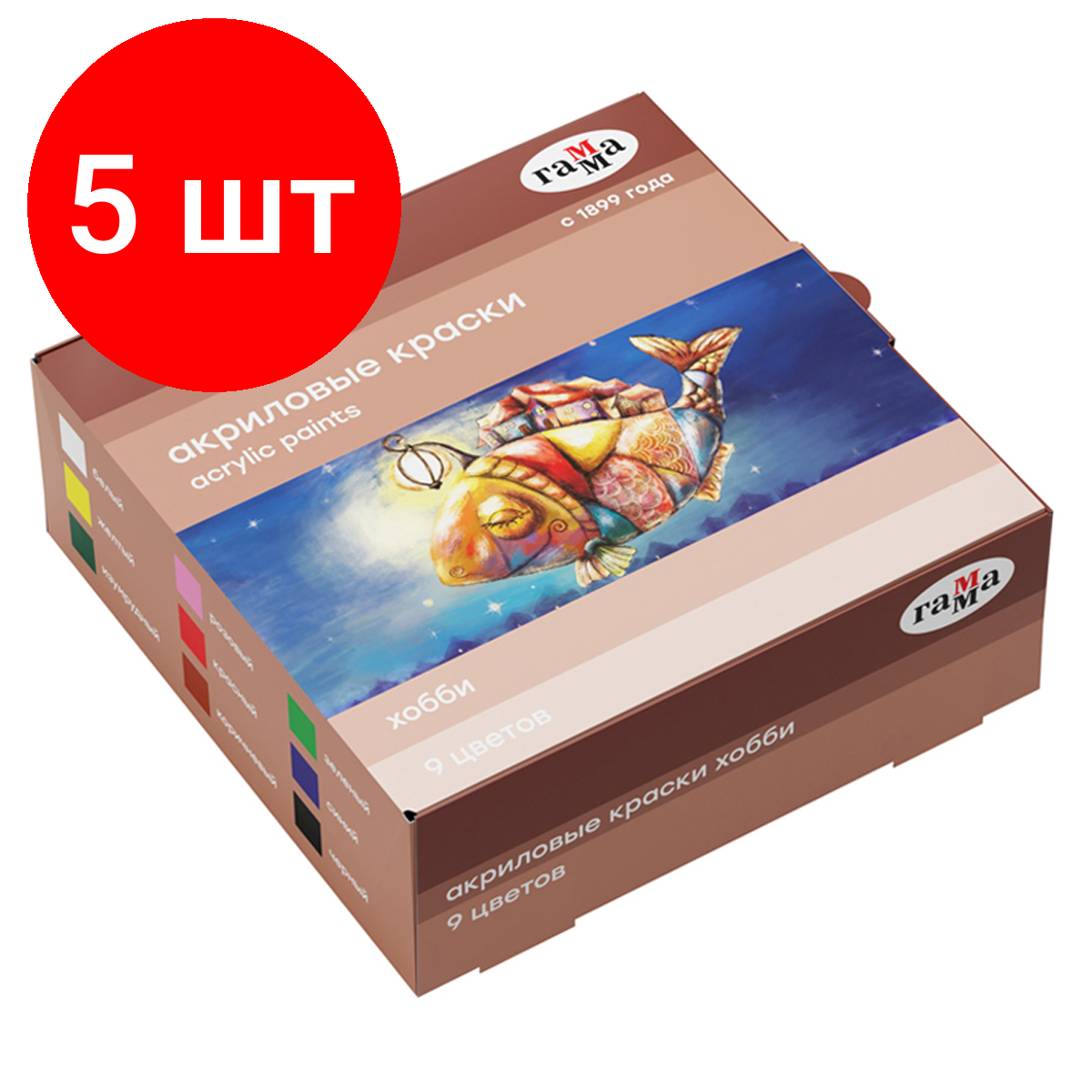 Купить Комплект 5 шт, Краски акриловые декоративные Гамма "Хобби", 09 цветов, 20мл, картон. упаковка