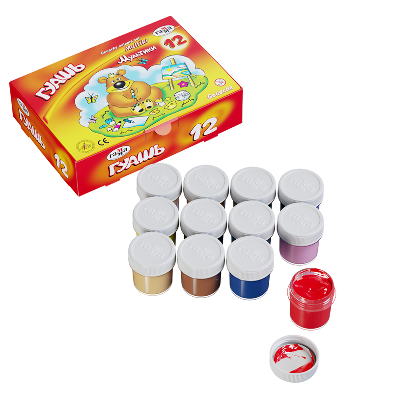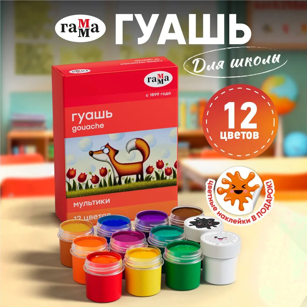 Купить Гуашь для школы 12 цветов Гамма "Мультики" в баночках, 20 мл.