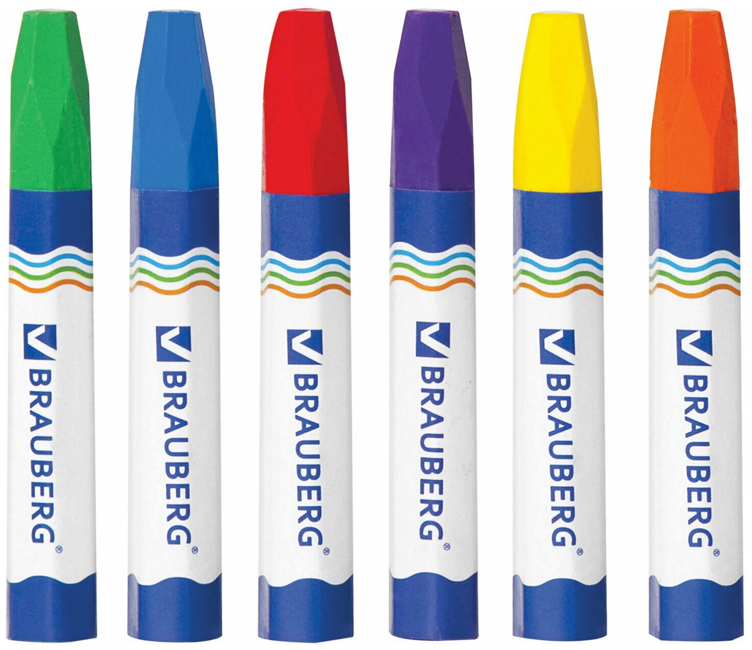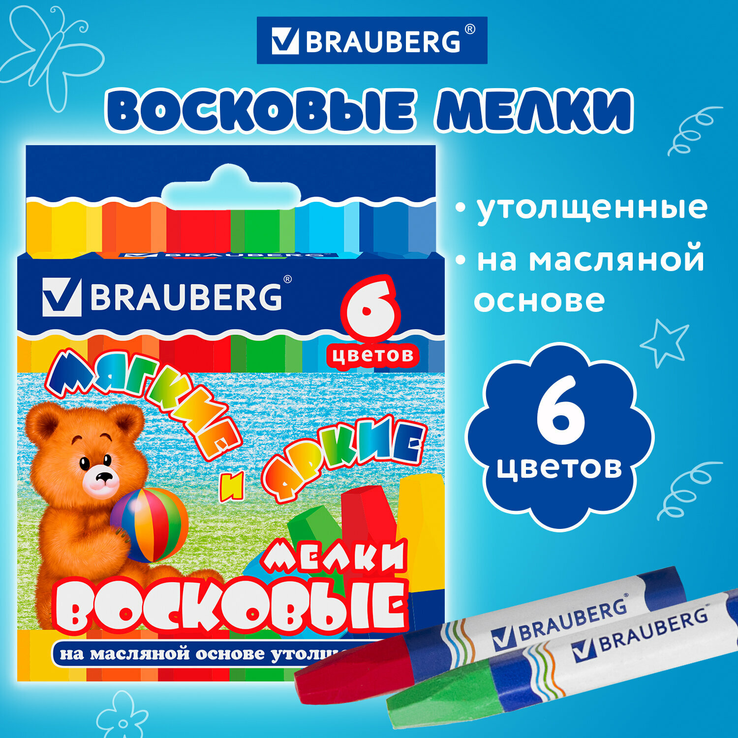 Мелки восковые 6 цветов Brauberg (D=11мм, 6гр, на масляной основе, утолщенные) (222969), 24 уп.