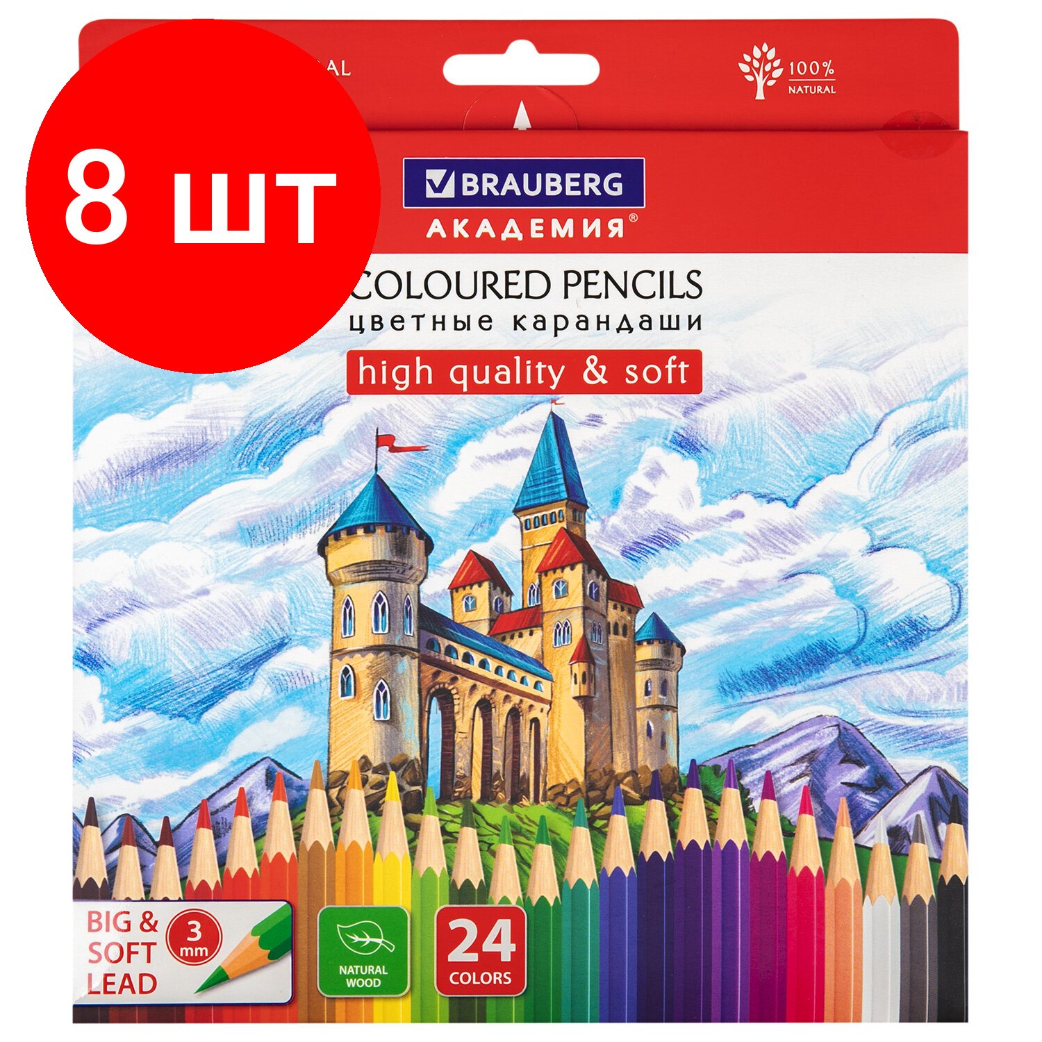 Купить Комплект 8 шт, Карандаши цветные мягкие BRAUBERG академия, 24 цвета, шестигранные, грифель 3 мм, 181866