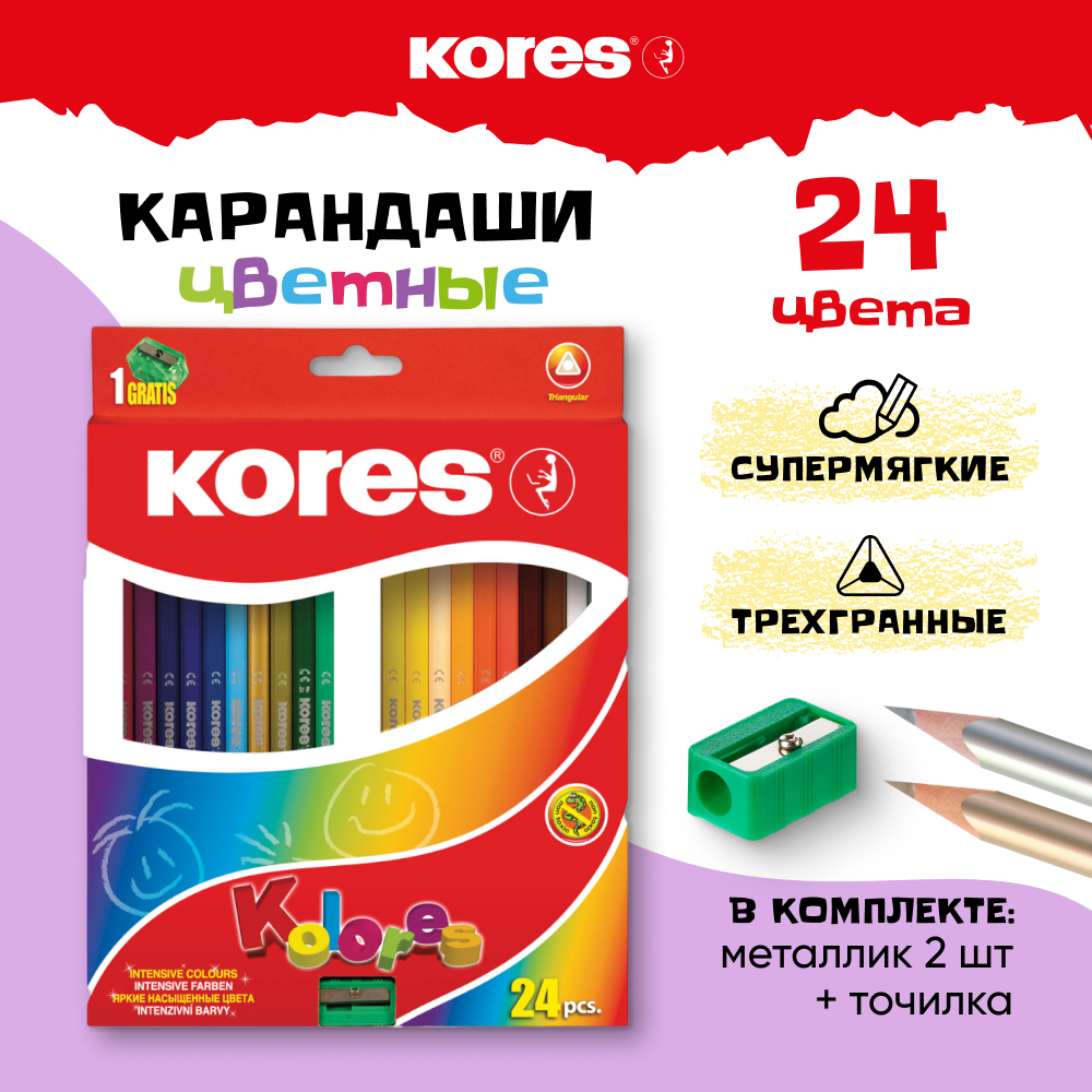Карандаши цветные для рисования Kores, мягкие, трехгранные, набор 24 цвета, в комплекте с точилкой