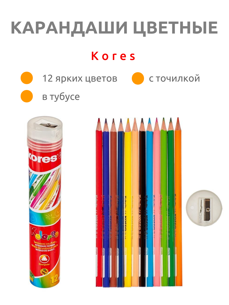 Карандаши цветные Kores, трехгранные, толщина грифеля 3 мм, набор 12 цветов+точилка интересное:
