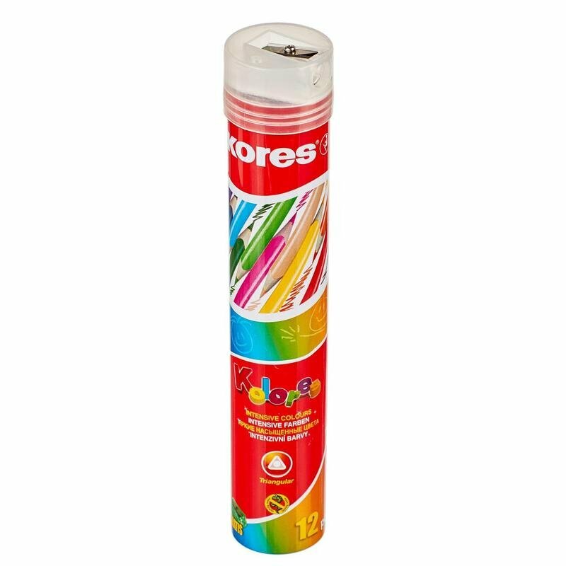 Карандаши цветные Kores, трехгранные, толщина грифеля 3 мм, набор 12 цветов, с точилкой