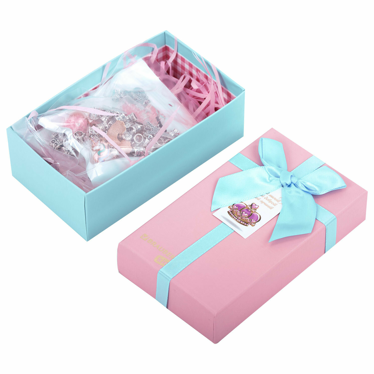 Набор для творчества и создания украшений и браслетов для девочек подарочный детский 66 элементов, бусины, шармы для рукоделия в боксе, Brauberg Kids Ассорти, 665296