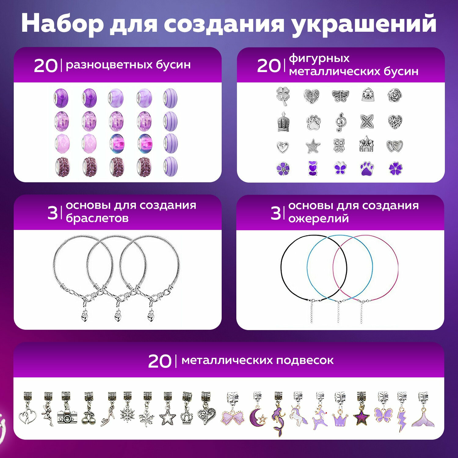 Набор для создания бижутерии и украшений 66 элементов Аметист, бусины, браслеты, подвески, BRAUBERG KIDS, 665289