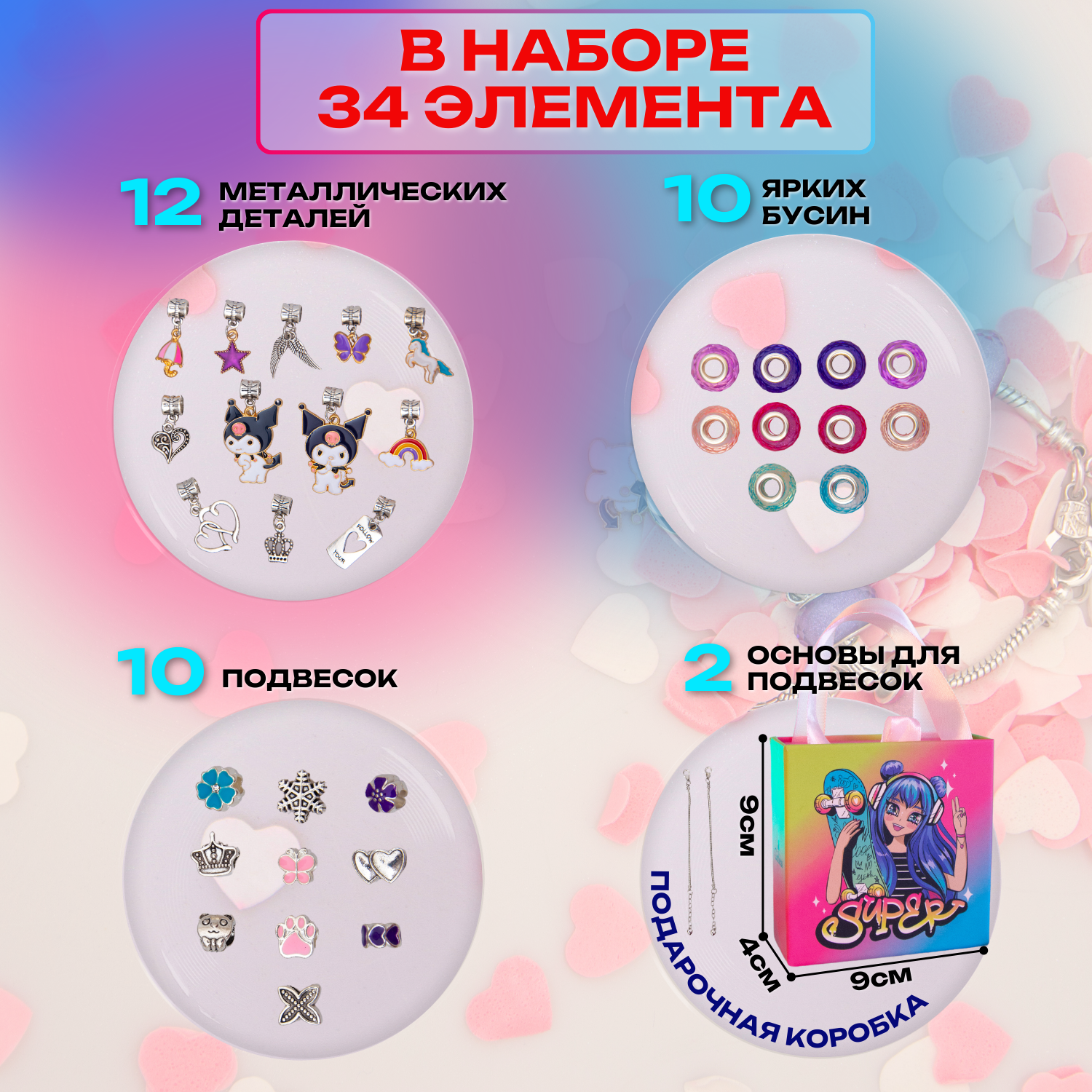 | Комплектация | цветные бусины - 10; шармы - 20; основы для браслетов - 2; подарочная коробка - 1 |