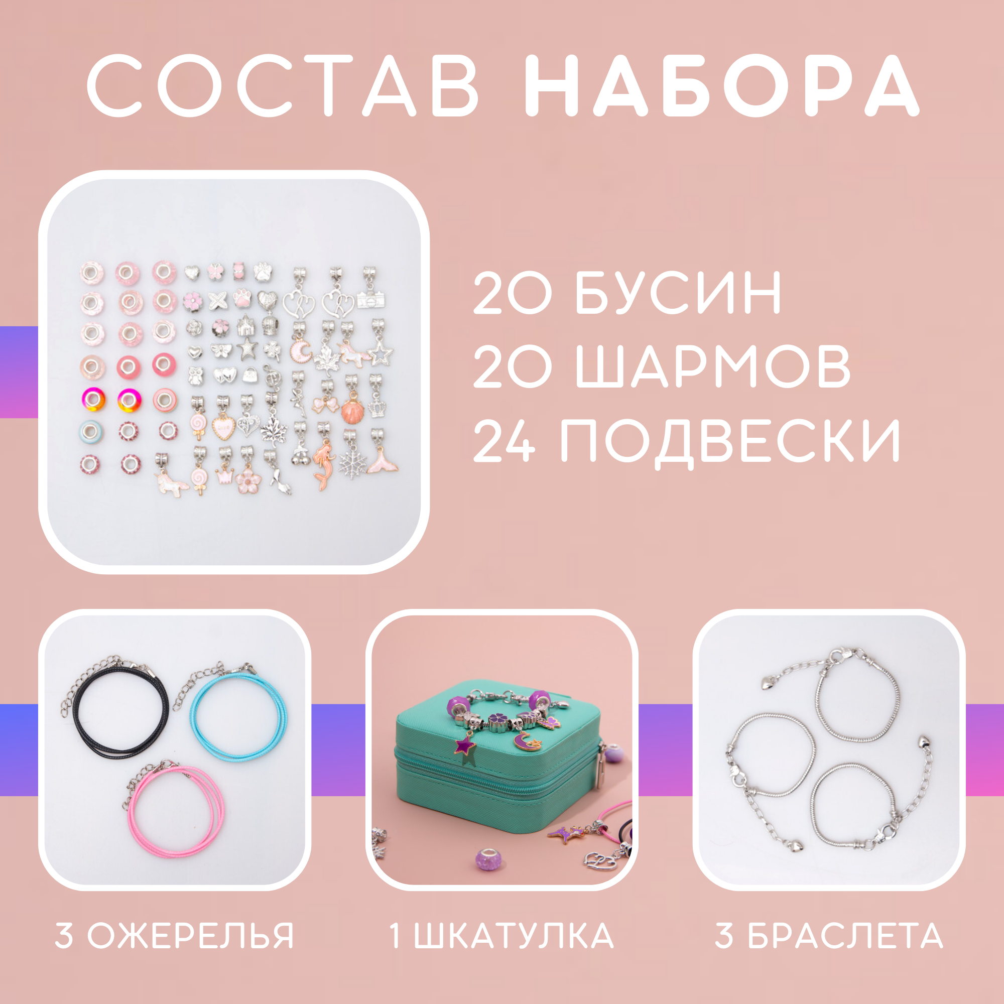 | Комплектация | цветные бусины - 10; шармы - 20; основы для браслетов - 2; подарочная коробка - 1 |