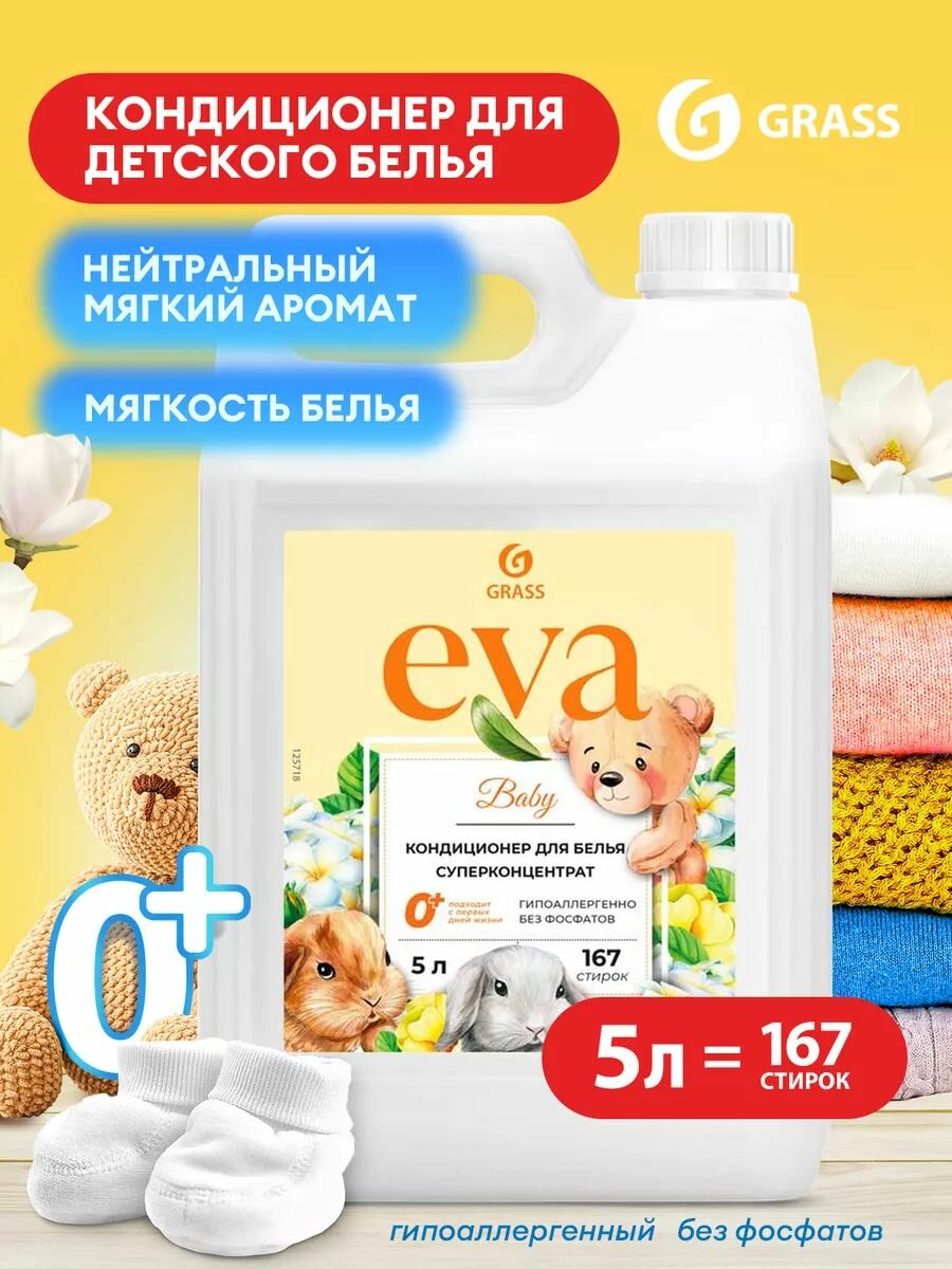 Купить Кондиционер ополаскиватель Grass для детского белья Eva Baby, гипоаллергенный 5л
