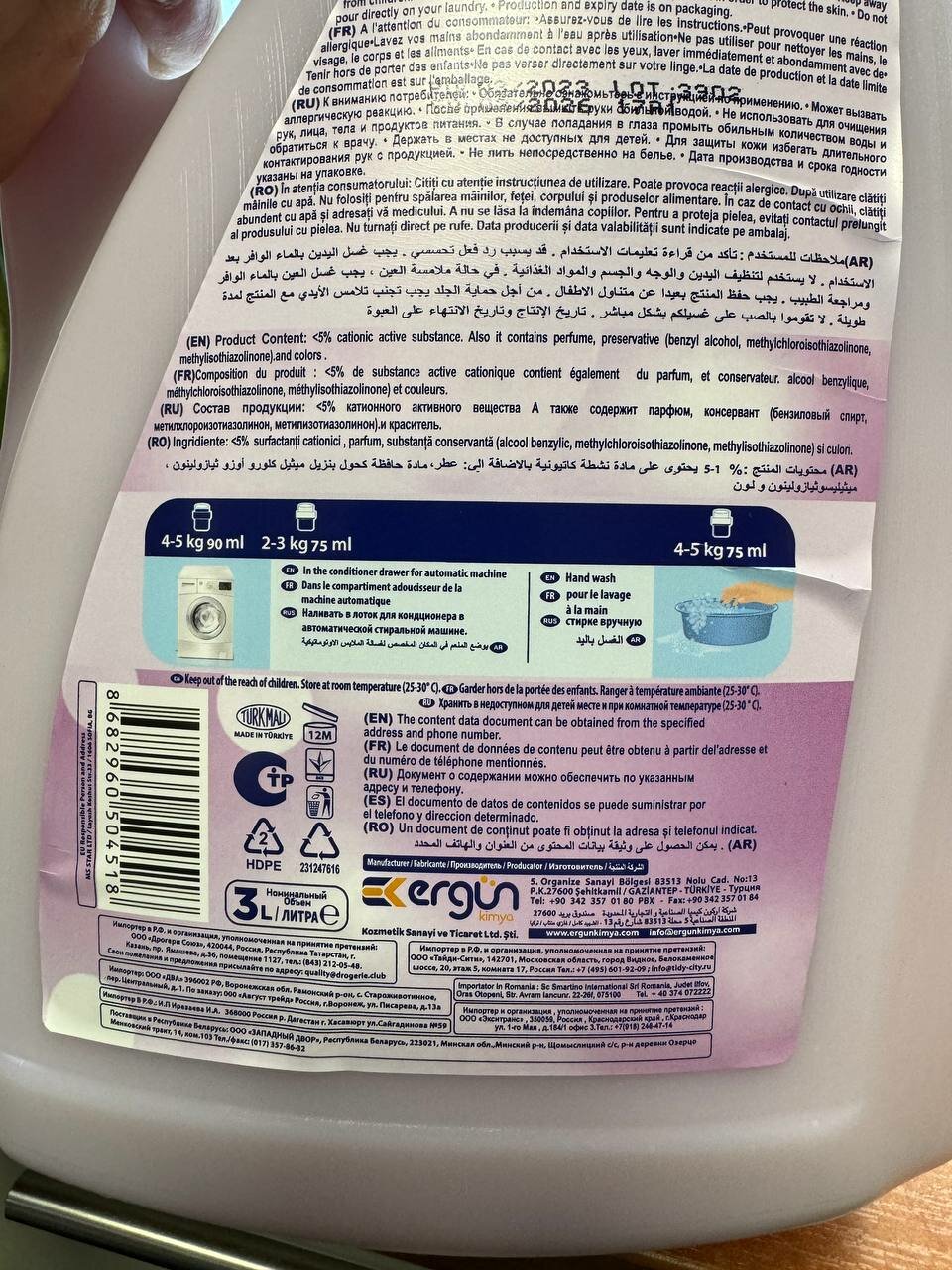 | Способ применения | добавить кондиционер в отделение для кондиционера в стиральной машине или в воду во время последнего полоскания при ручной стирке, от 50 до 130 мл в зависимости от количества белья и жесткости воды. |