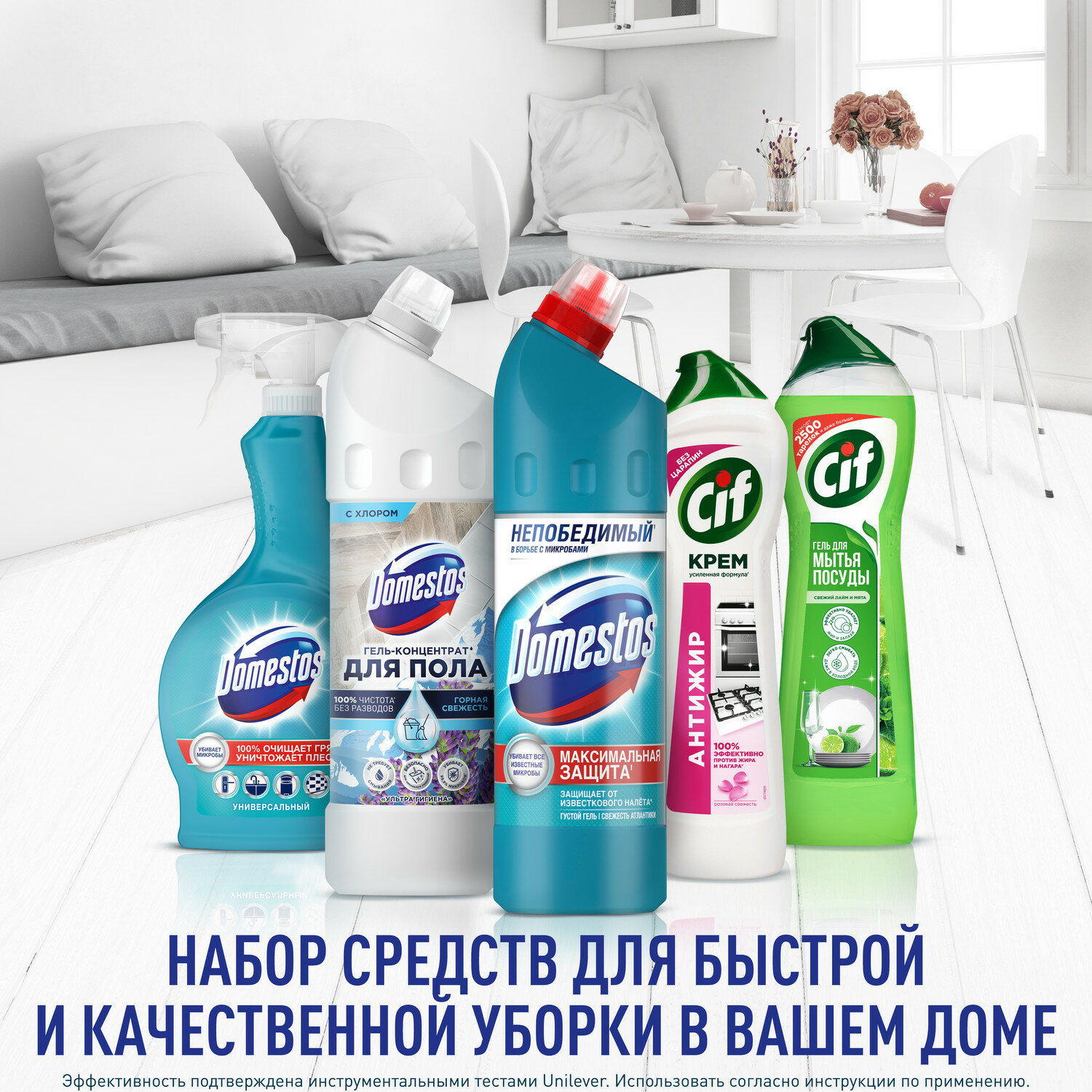 | Подробная комплектация | Domestos средство для мытья пола и других поверхностей ультра гигиена 1000мл, Domestos средство универсальное свежесть атлантики 750мл, Domestos универсальное средство спрей 500мл, Cif крем чистящий розовая свежесть 500мл, Cif средство для ручного мытья посуды 500мл |