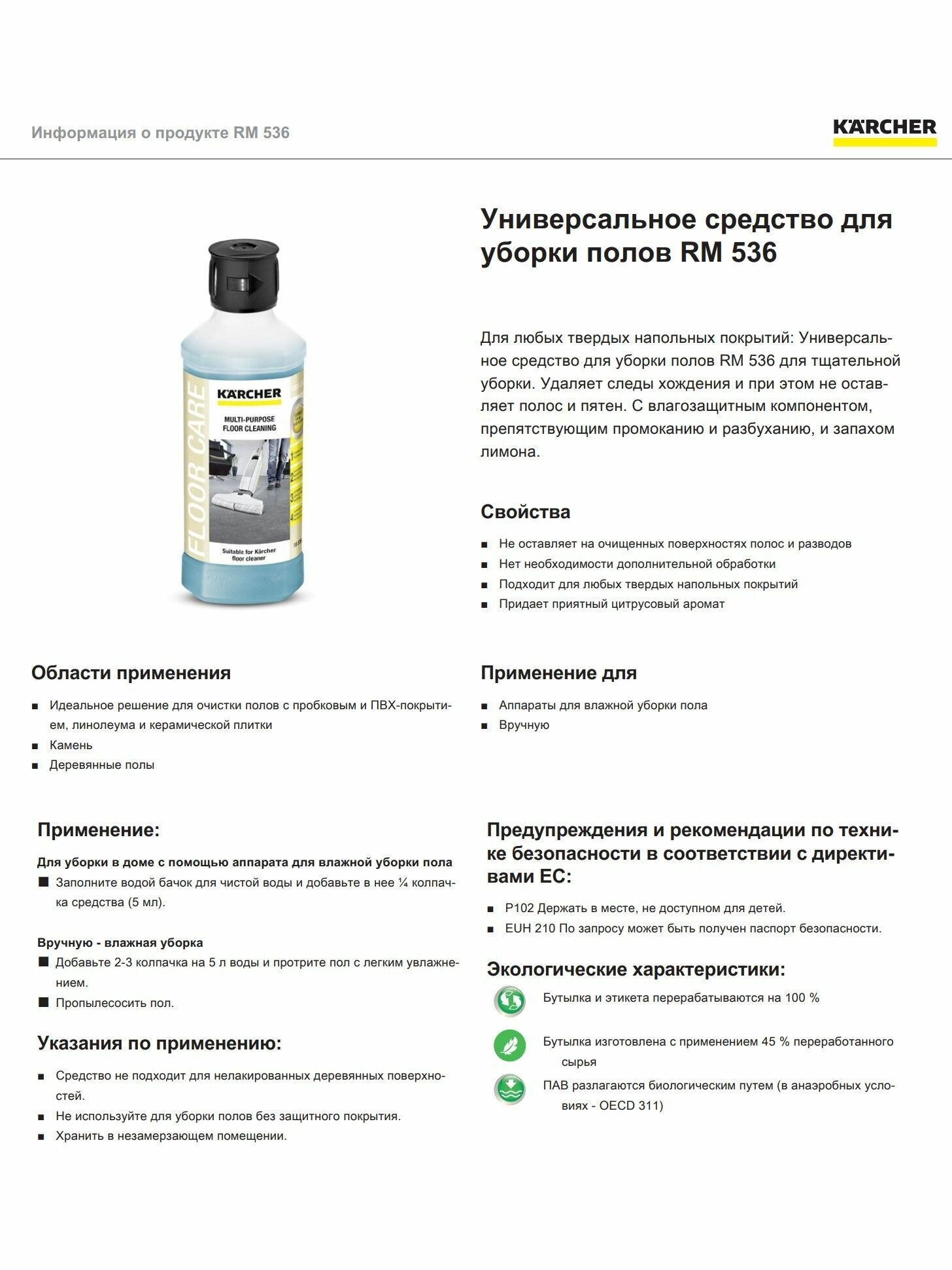 | Подробная комплектация | Универсальное средство для уборки полов Karcher RM 536, 0,5л, 6.295-944.0-1шт |