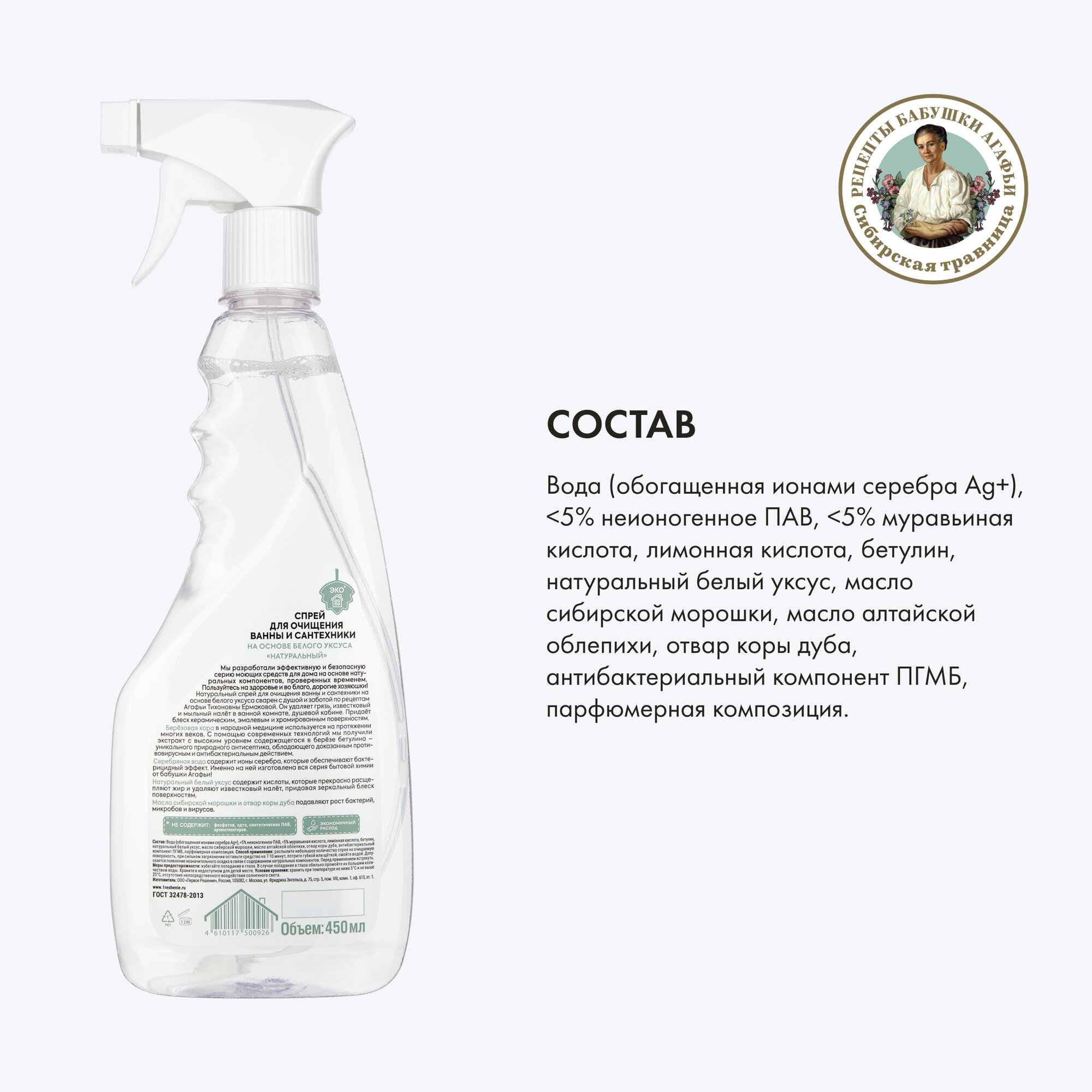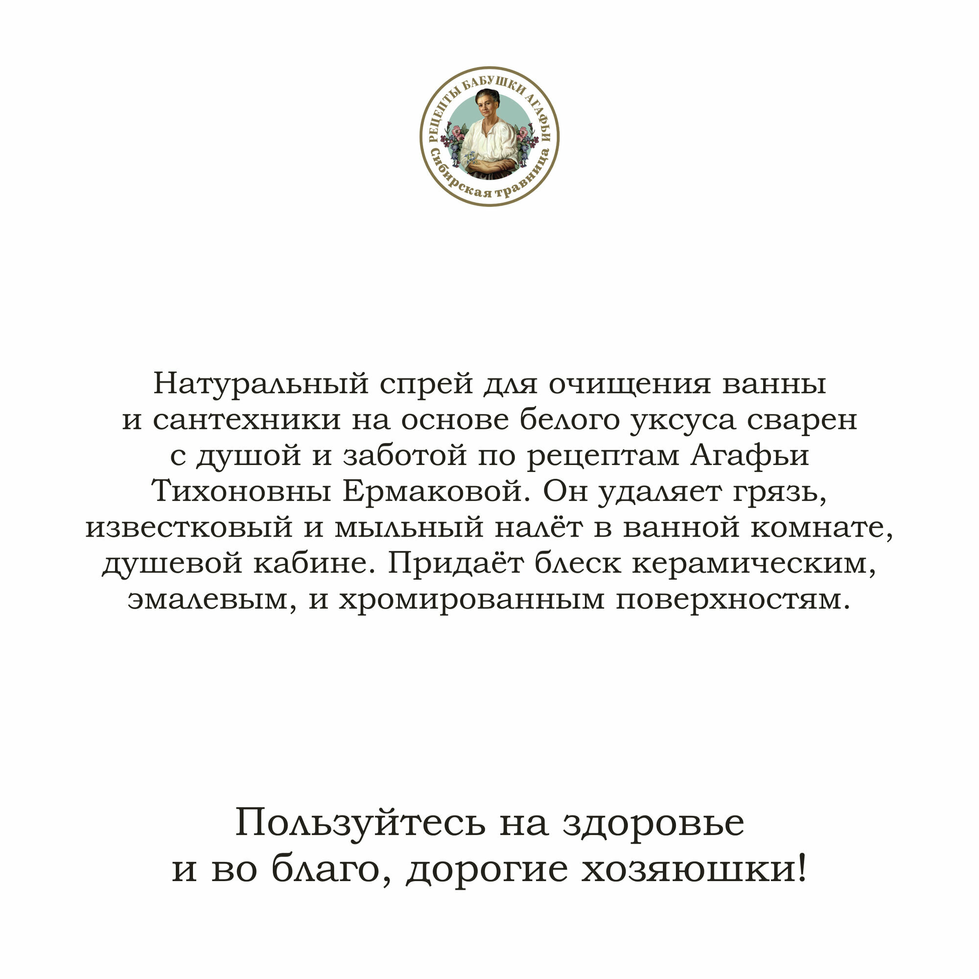 Купить Рецепты бабушки Агафьи Спрей для очищения ванны и сантехники на основе белого уксуса, 450 мл