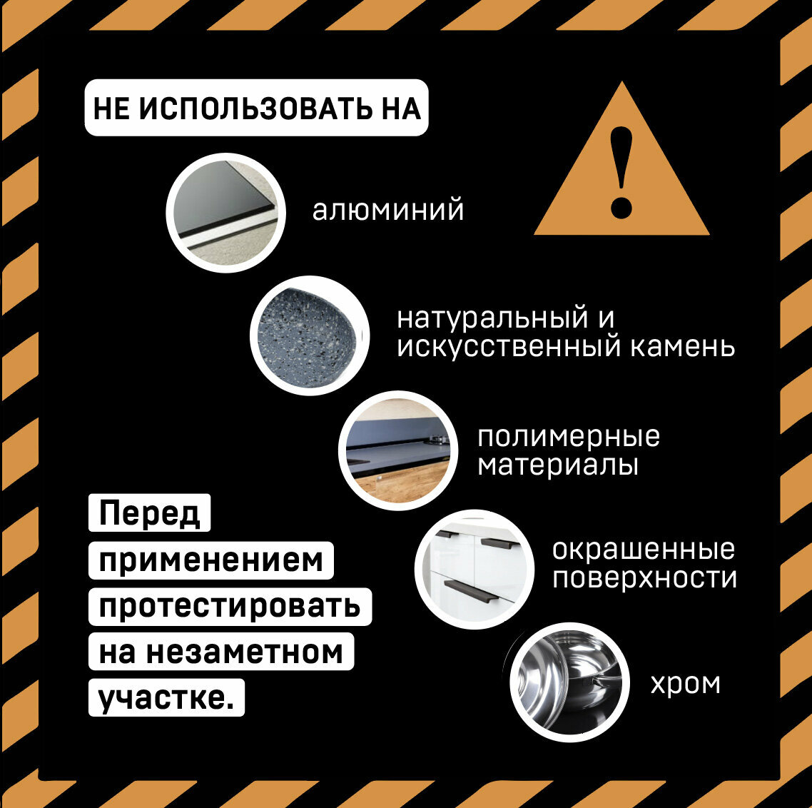 | Эффект | выведение пятен / обезжиривание / придание блеска / удаление накипи / устранение застарелого жира / устранение нагара / устранение накипи |
