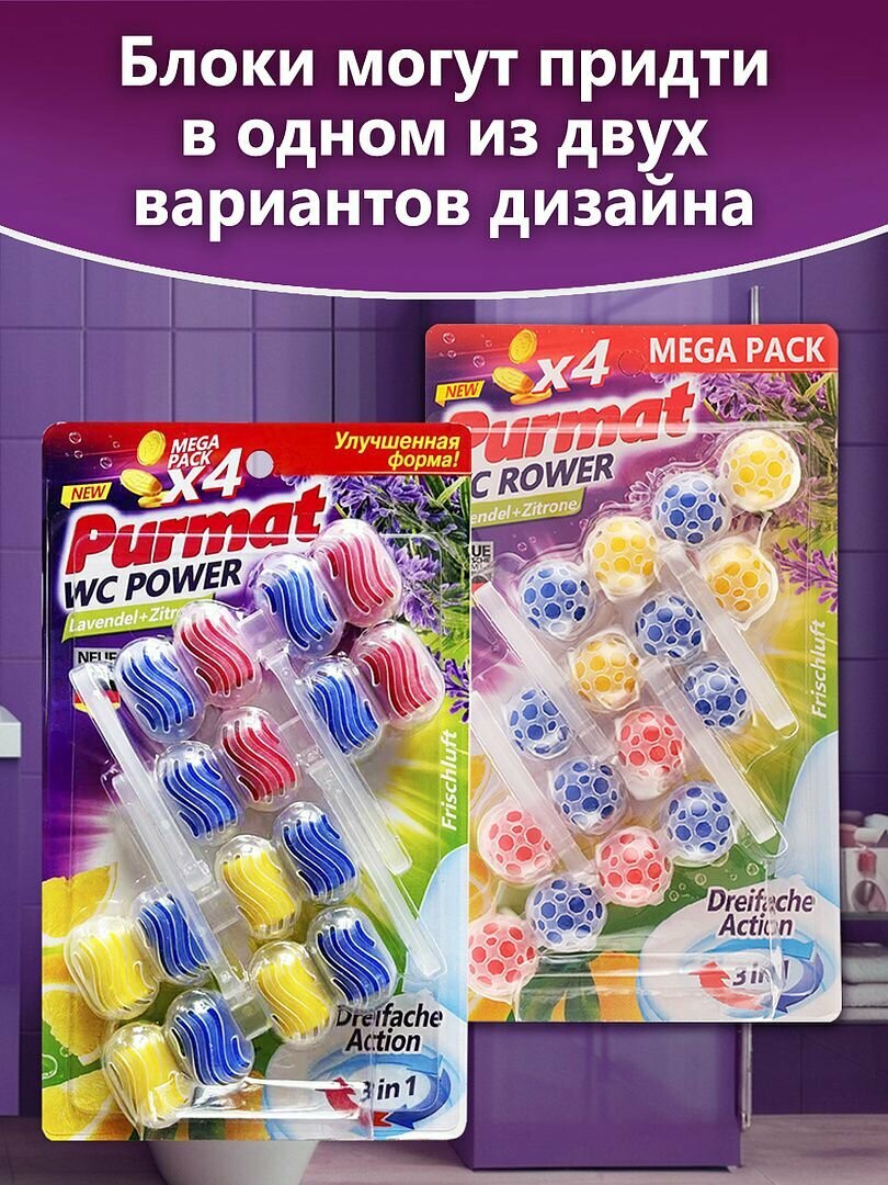 Купить Средство для чистки унитаза Purmat Лаванда/Лимон, таблетки (шарики), 8 сменных блоков по 50 гр, освежитель подвесной в туалет от налета, 2 пачки по 4 блока