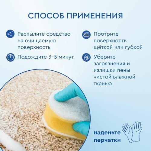 | Способ применения | нанесите средство на очищаемую поверхность и оставьте на 3-5 минут. Протрите поверхность щёткой или губкой. Уберите излишки пены и протрите поверхность чистой влажной тканью. |